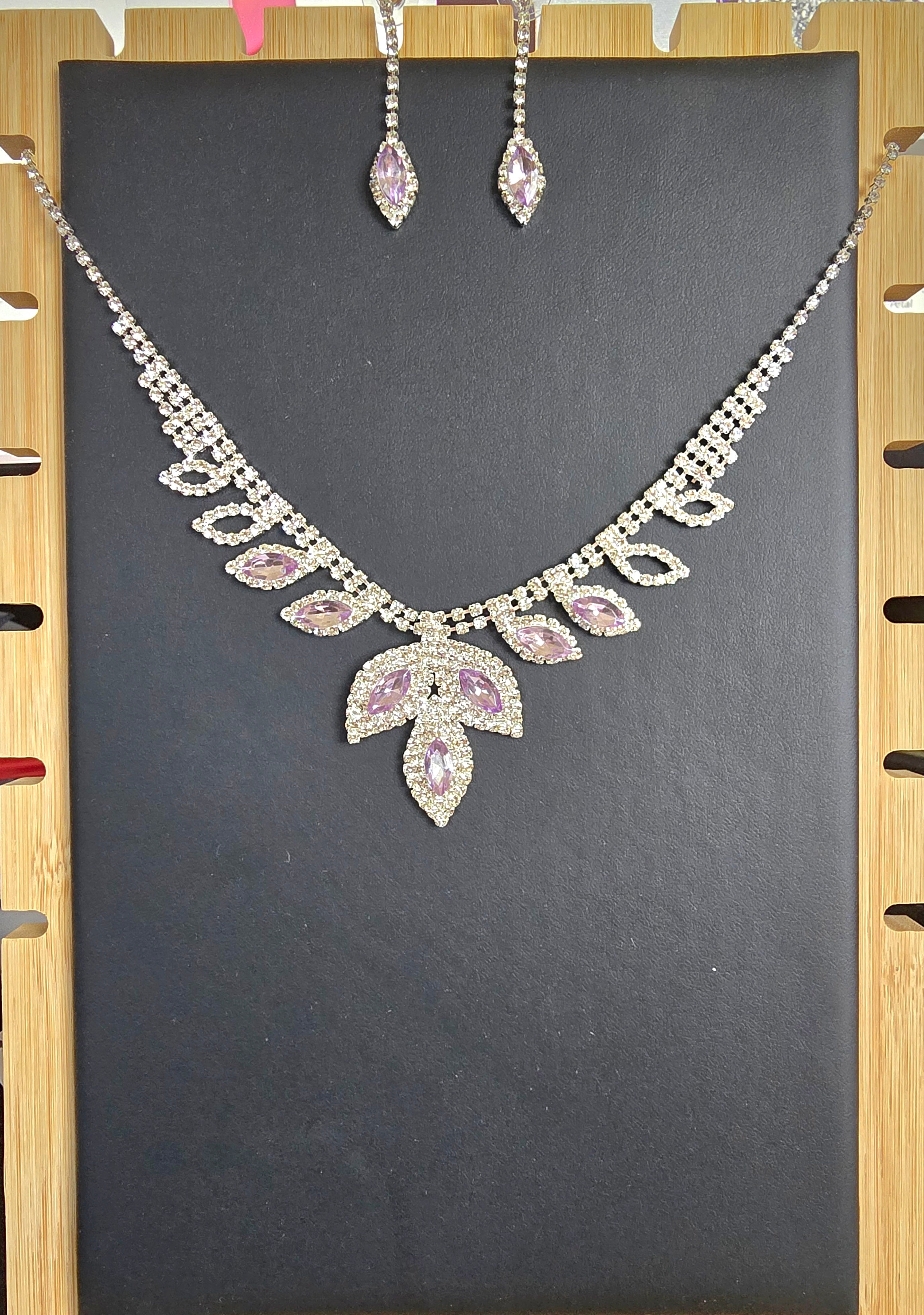 This jewelry set is pure elegance with a touch of regal drama 💜. The necklace features a graceful chain with adjustable length, leading to a dazzling centerpiece: a symmetrical arrangement of marquise-cut purple gemstones, each framed by a halo of clear stones that amplify their brilliance. The shape evokes delicate petals or wings, giving it a romantic, almost ethereal quality.