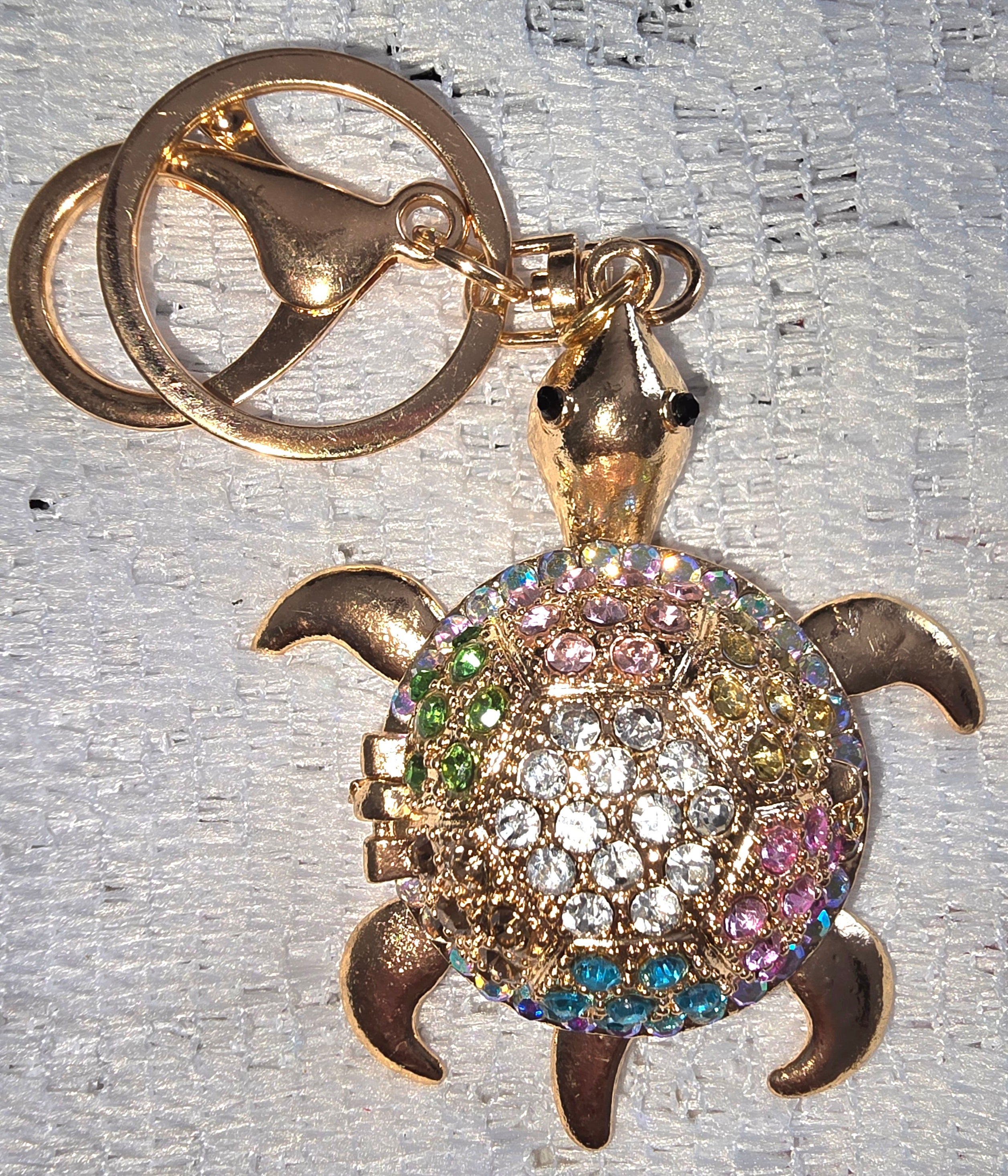 This dazzling turtle keychain is a miniature masterpiece of whimsy and opulence. Its shell sparkles with a kaleidoscope of rhinestones—clear, emerald green, blush pink, sapphire blue, and amethyst purple—arranged in a radiant, circular mosaic. The turtle’s body gleams in polished gold, with sculpted legs, tail, and a sweetly rounded head that add charm and character. A dual attachment system—classic ring and lobster clasp—makes it both functional and fabulous. Whether clipped to a designer tote or dangling from a luxe pouch, it’s a statement of playful elegance.