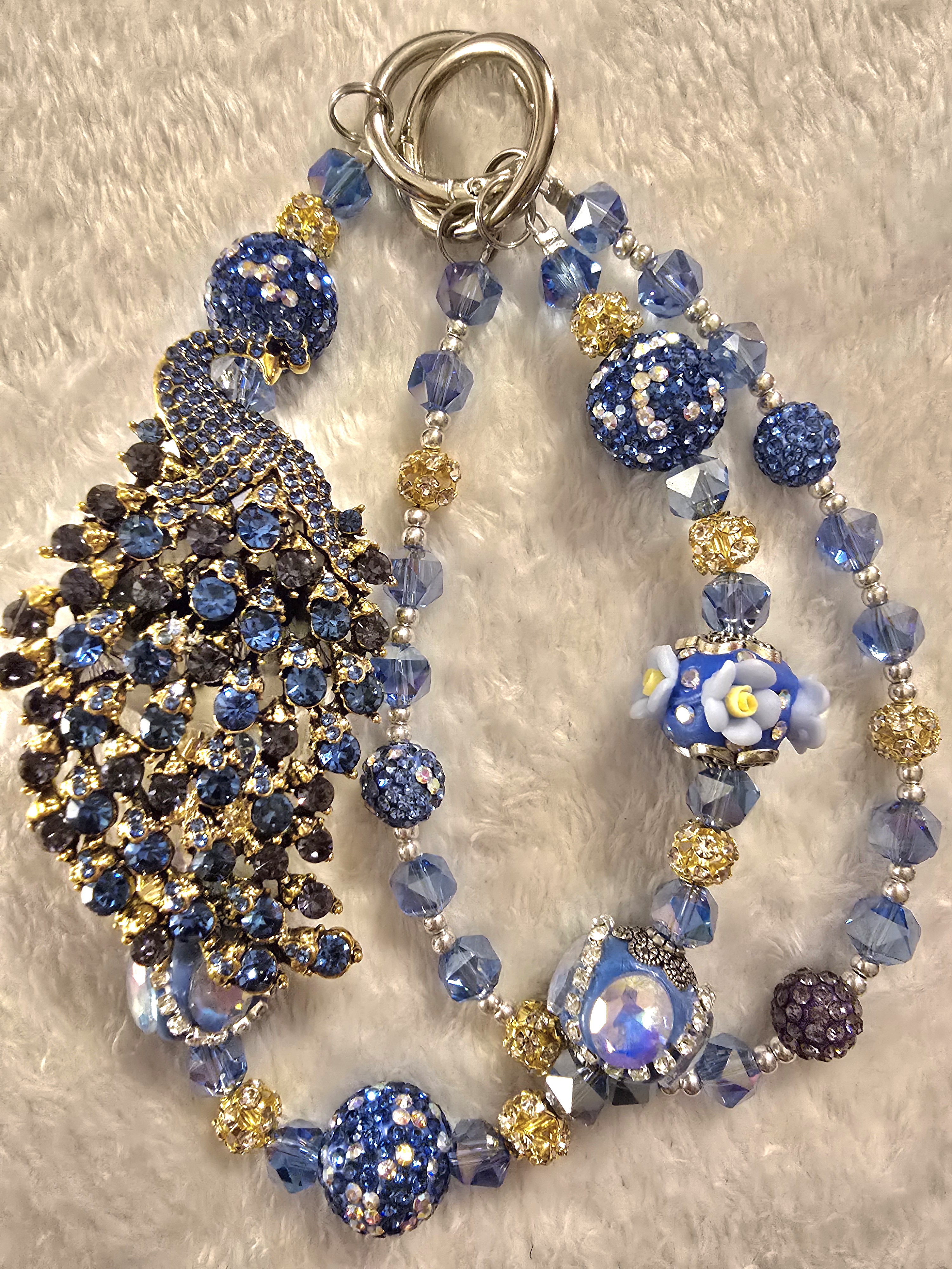 This piece is a dazzling celebration of opulence and artistry. The peacock—regal in blue and gold rhinestones—anchors the design with its iconic symbolism of beauty and pride. Surrounding it, the beads shimmer in a palette of sapphire, champagne, and silver, each one uniquely embellished to evoke a sense of curated luxury.