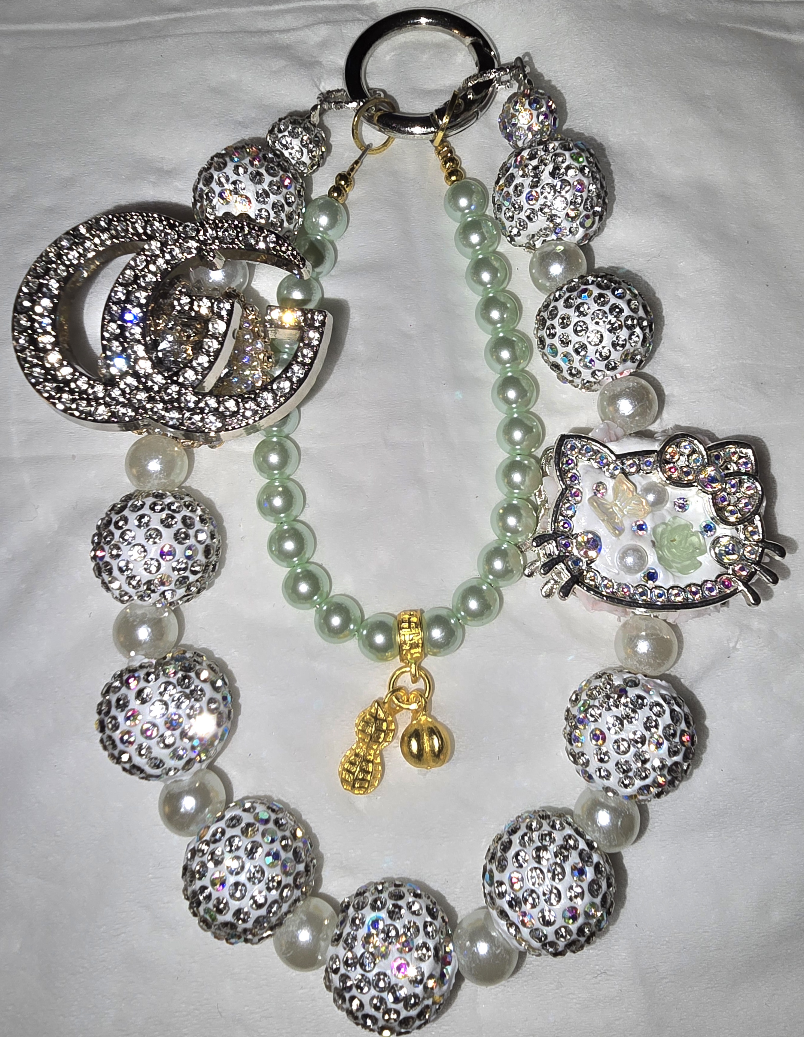 ✨ A glamorous, eye-catching accessory plays across a crisp white surface. The centerpiece is a bold chain alternating between oversized pearl-like beads and shimmering rhinestone-studded spheres, radiating opulence with every glint. Nearby, a playful smaller green beaded chain adds charm with its whimsical gold peanut and bell charm, injecting personality into the layout.