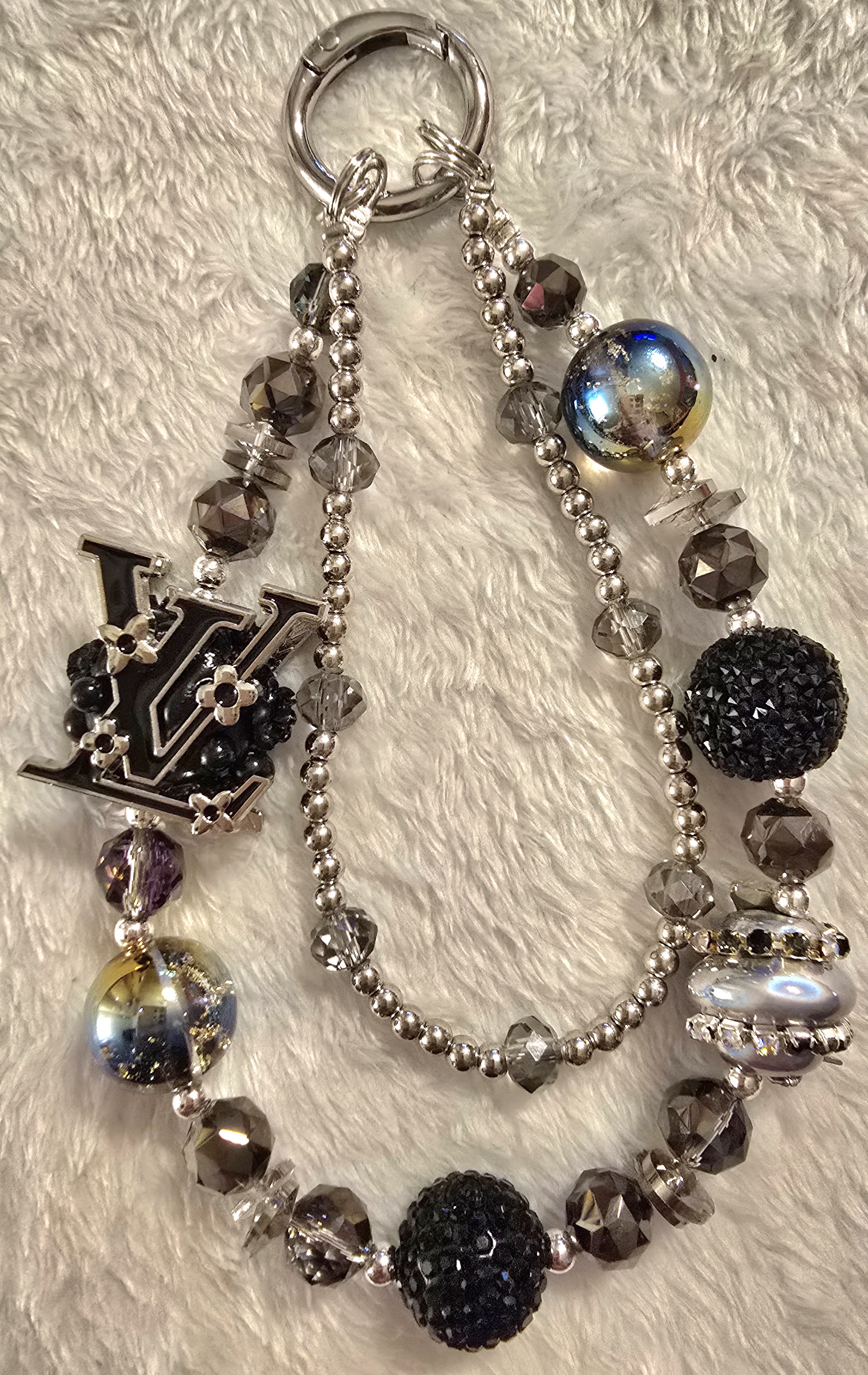 ✨ This designer accessory chain is a luxe statement piece that blends elegance with playful charm. It features a mix of metallic and faceted beads in varying sizes and finishes, creating a rich texture that catches the light beautifully. The standout element is the iconic LV logo, embellished with delicate floral accents that add a touch of whimsy to its bold branding.