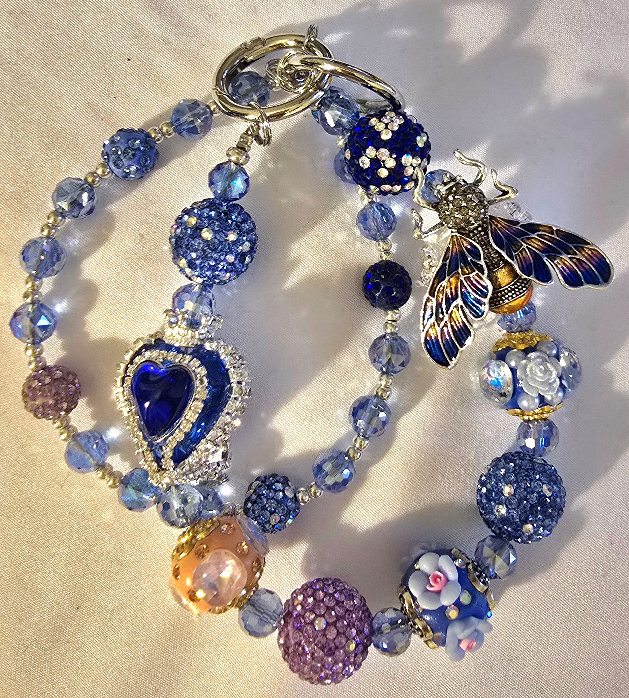 Step into a twilight reverie with the Midnight Garden Charm Chain, where deep sapphire blues and soft violets bloom across a silver path. Each bead tells a story—rhinestone-encrusted or delicately etched, they shimmer like dew-kissed petals under moonlight. A heart-shaped charm glows with a mysterious blue center, while a dainty bee flutters nearby, its wings etched with golden whispers. Finished with a sleek silver clasp, this chain is a curated bouquet of enchantment—perfect for dreamers, collectors, and charm connoisseurs alike.