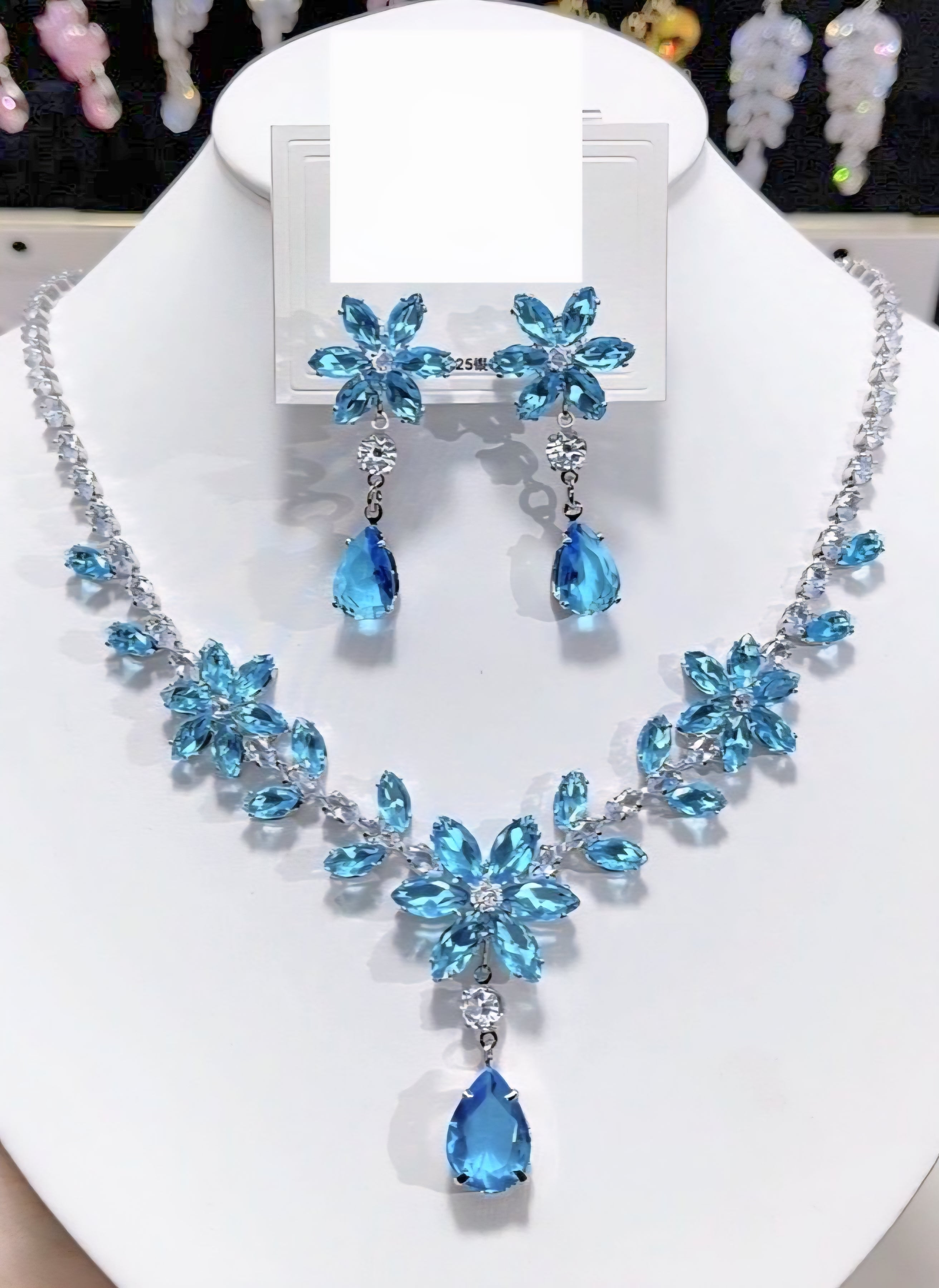 This regal jewelry set evokes the elegance of a moonlit garden in full bloom. The necklace features a symmetrical cascade of sapphire-hued floral clusters, each petal formed from faceted blue gemstones that shimmer like dew-kissed blossoms. Clear stones act as delicate connectors, adding a crystalline sparkle that enhances the overall luminosity. At its heart, a teardrop-shaped blue gem dangles like a single, perfect bloom—dramatic and serene. The matching earrings echo this motif, with floral clusters and teardrop gems that sway gracefully, framing the face with refined brilliance. The set feels both timeless and theatrical—ideal for gala nights, romantic soirées, or royal-themed editorials.