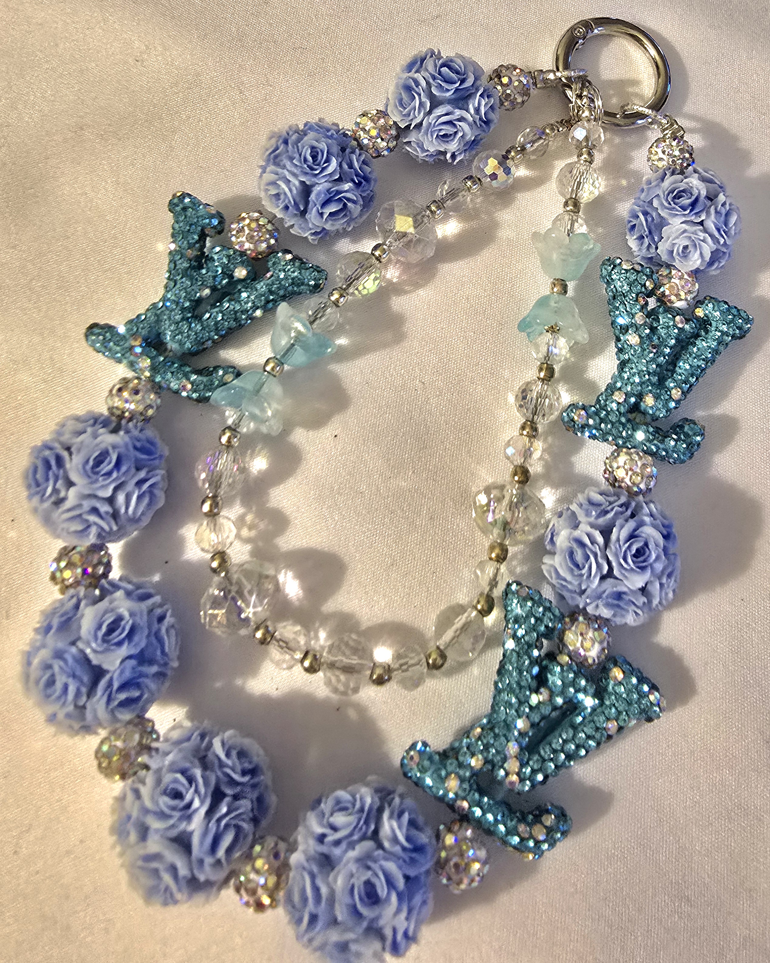 🌟 A standout feature? The gleaming blue glitter letter charms forming “LV”—a cheeky nod to high-end branding that adds just the right dose of glam. Perfect for someone who knows how to turn statement accessories into storytelling.