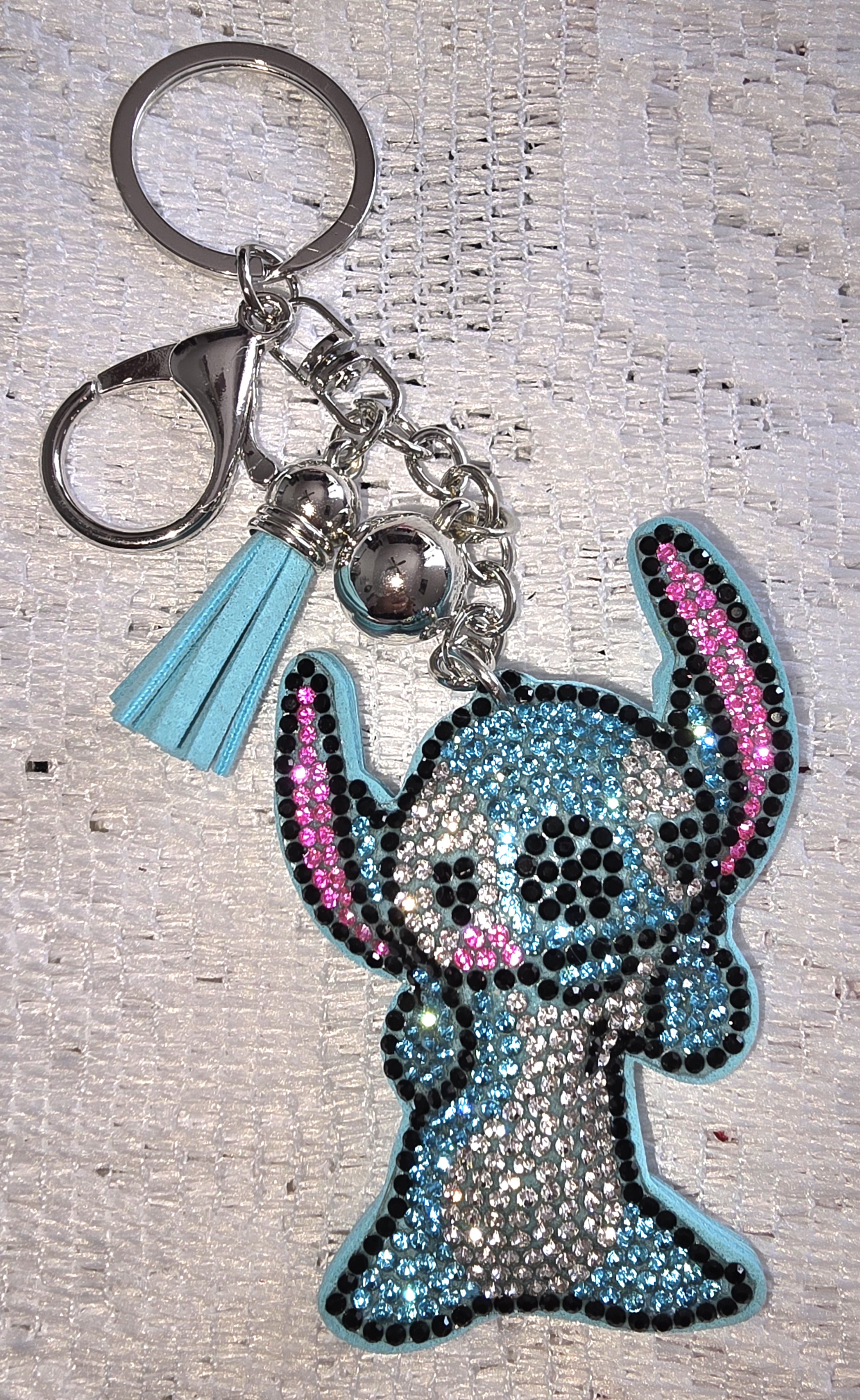 This dazzling keychain transforms Stitch into a rhinestone-studded icon of playful luxury. His signature blue silhouette is reimagined in shimmering crystals—icy blue, silver, and jet black—while pink accents add a touch of sweetness to his ears and paws. A metallic silver bell jingles with charm, and a silky blue tassel adds movement and flair. The overall effect is whimsical yet elevated, perfect for accessorizing a designer handbag or adding sparkle to everyday essentials.
