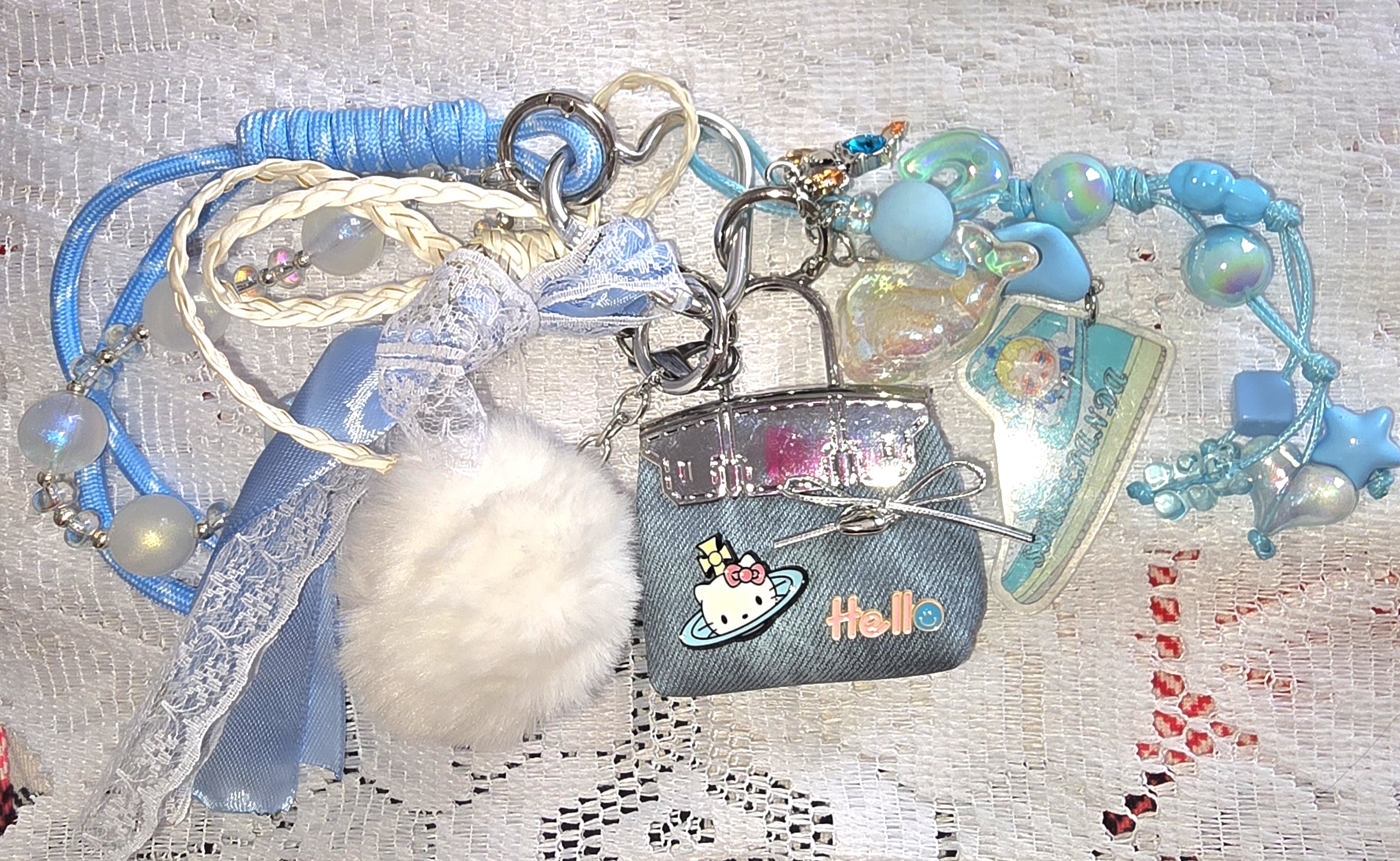 This dreamy accessory ensemble feels like a whimsical galaxy picnic wrapped in lace. The mix of textures—fluffy pom-pom, braided cord, iridescent beads, and denim HK pouch—creates a tactile storybook charm. The denim pouch with a silver top and planet motif whispers cosmic curiosity, while the pastel beads and lace ribbon evoke a soft, celestial innocence. The clear tag with character art adds a playful, collectible vibe, like a treasured trinket from a magical arcade. Altogether, it’s a curated constellation of cuteness, perfect for someone who blends fantasy with fashion.