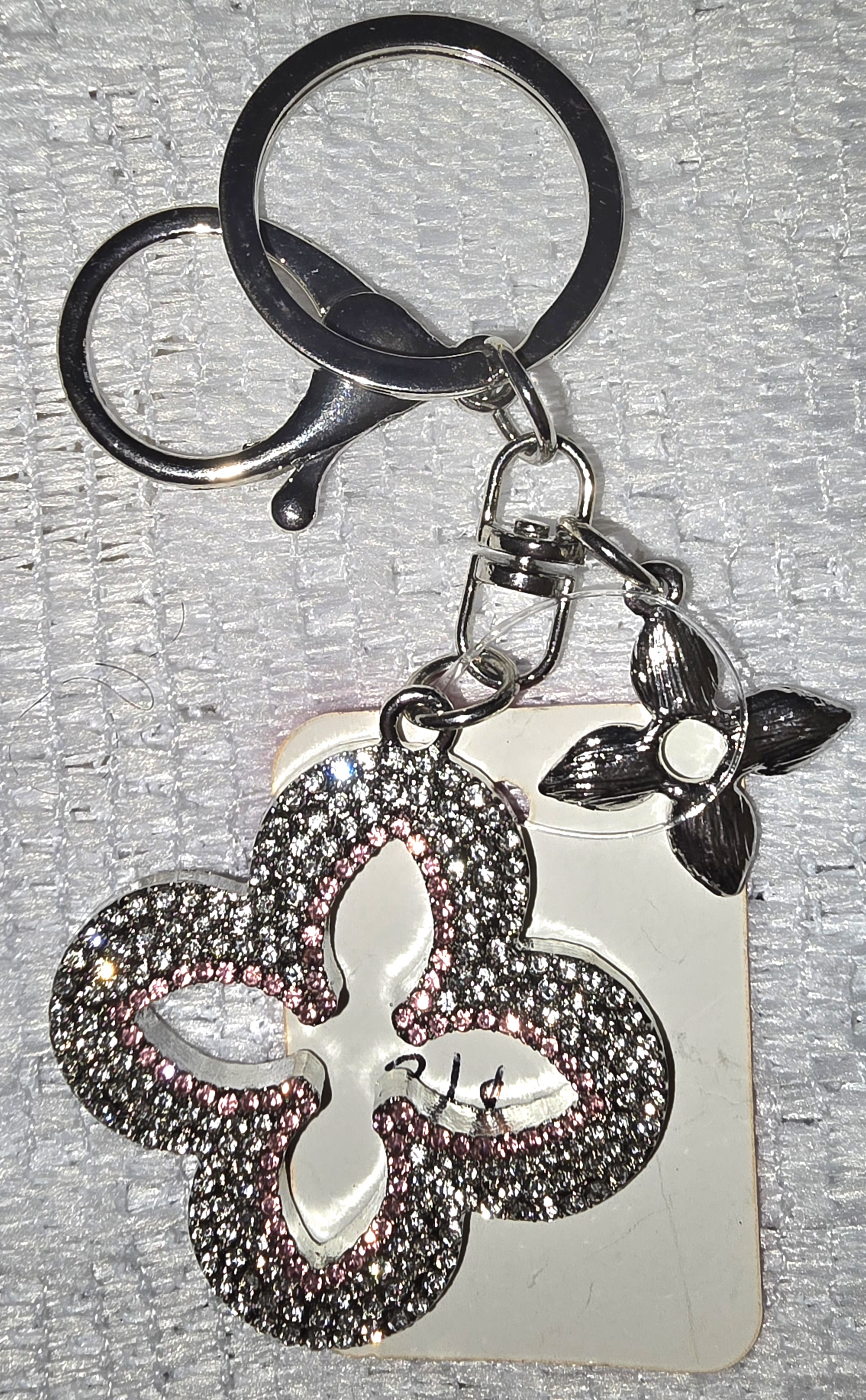 This LV keychain is a dazzling fusion of elegance and charm. The centerpiece is a large, four-petal flower pendant encrusted with shimmering rhinestones—silver-toned with blush pink accents that catch the light like morning dew. Its openwork design gives it a delicate, airy feel, while the sparkle adds a touch of opulence. Dangling nearby is a smaller metallic flower charm, more traditional in shape, offering a subtle contrast in texture and tone. The entire ensemble is anchored by a sleek metal clasp and ring, making it both functional and fabulous.