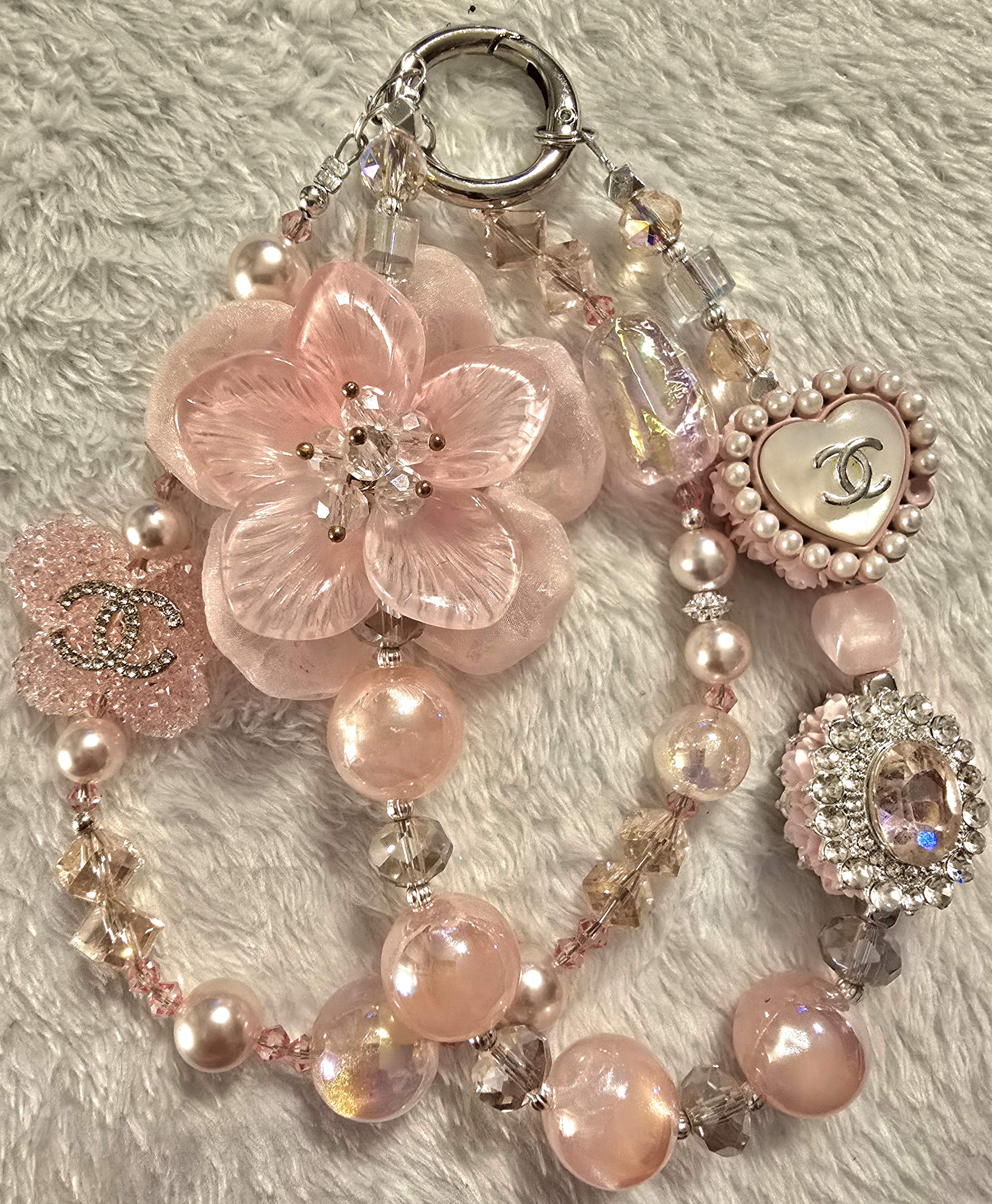 - A glittery pink flower with the CC logo in rhinestones