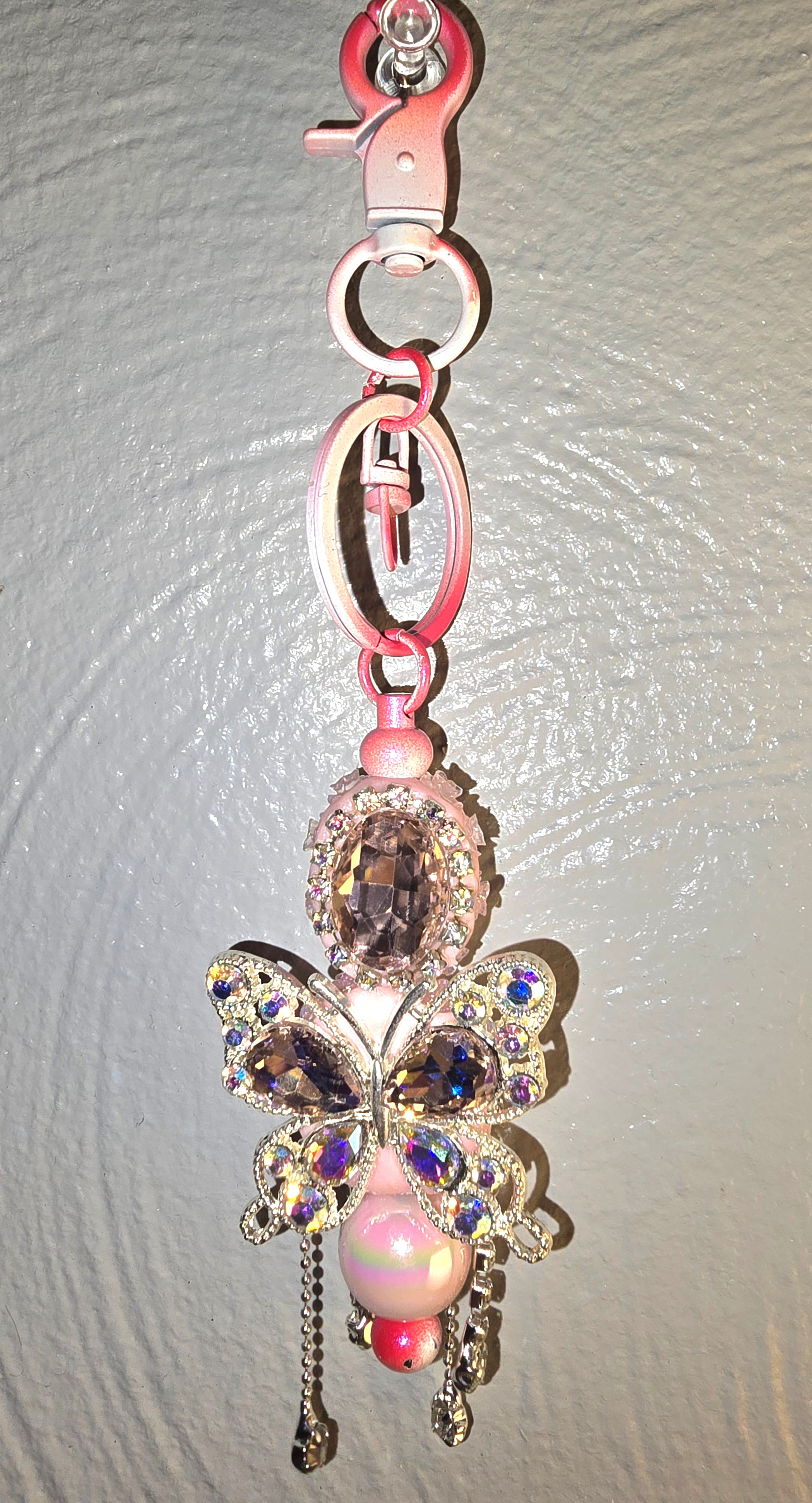 This accessory is pure fantasy-meets-finery. A pink clasp and chain cascade into a dazzling butterfly centerpiece, its wings unfurling in metallic shimmer and gemstone brilliance. The butterfly is encrusted with violet and clear stones, radiating a regal glow, while delicate chains dangle like enchanted threads. Above it, a large oval gem—framed by a halo of smaller stones—crowns the piece like a magical talisman. Below, soft pink and pearlescent beads add a dreamy finish, evoking rose gardens and moonlit wishes. It’s not just a keychain—it’s a miniature fairytale.