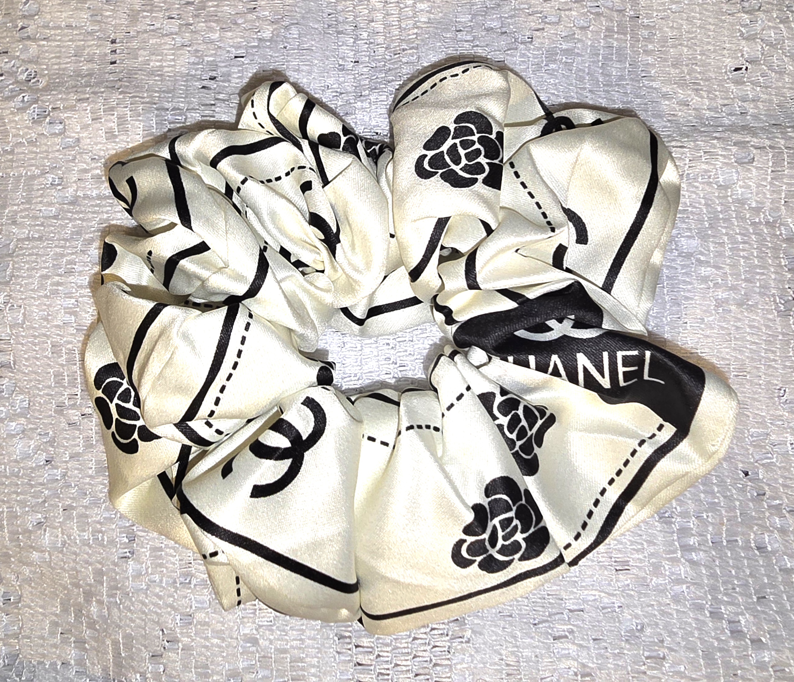 A silky, high fashion scrunchie that channels the elegance of Parisian couture. Its creamy satin base is adorned with bold black Coco motifs—interlocking C’s, camellia blossoms, and the iconic designer’s name—creating a striking contrast that feels both timeless and playful. The camellias add a soft, romantic touch, while the graphic logos lend it unmistakable brand power. Perfect for elevating a casual ponytail or accenting a wrist stack with a whisper of luxury.