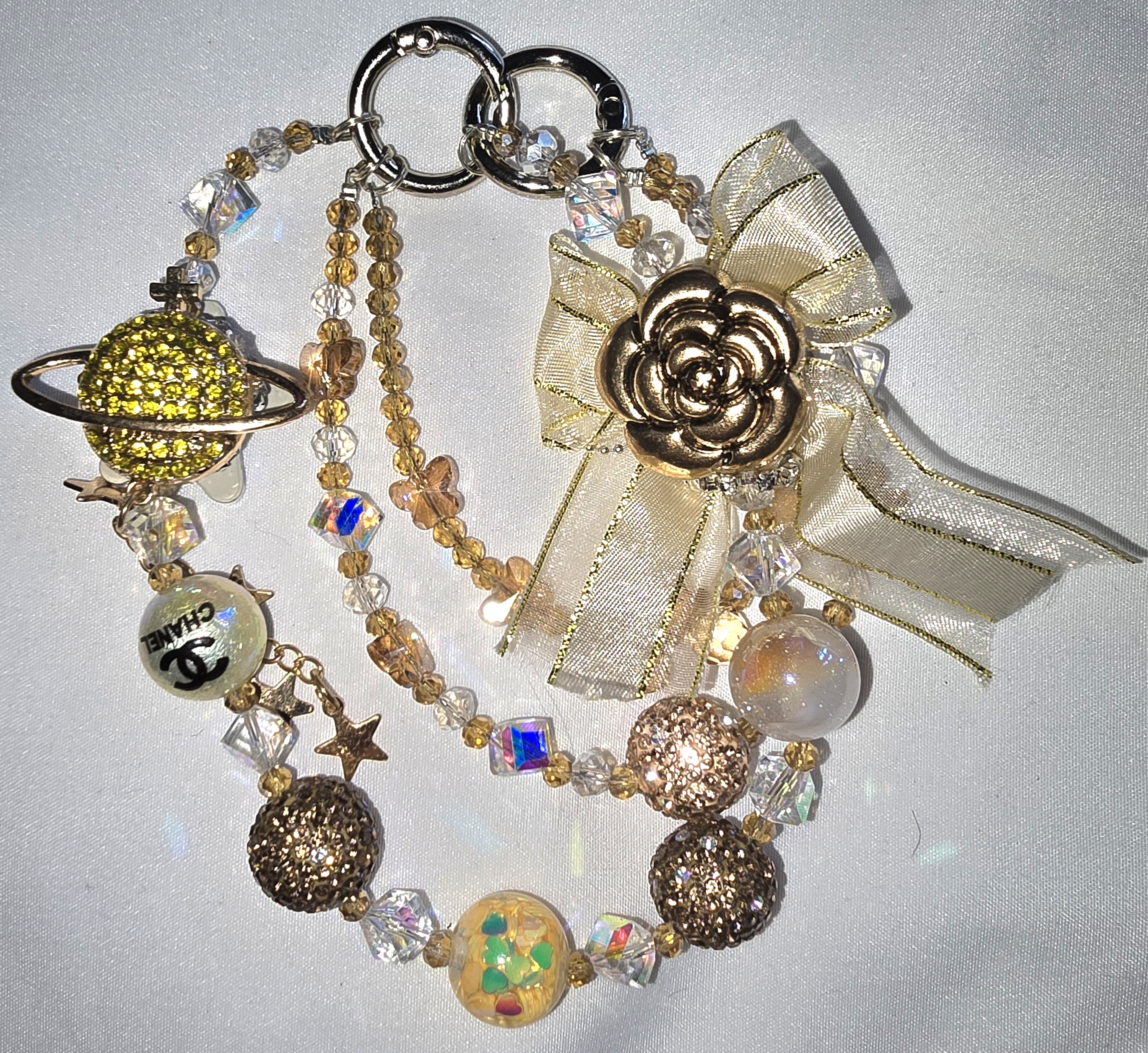 This accessory is a dazzling fusion of luxury branding, cosmic whimsy, and floral elegance. Here’s a breakdown of its standout elements: