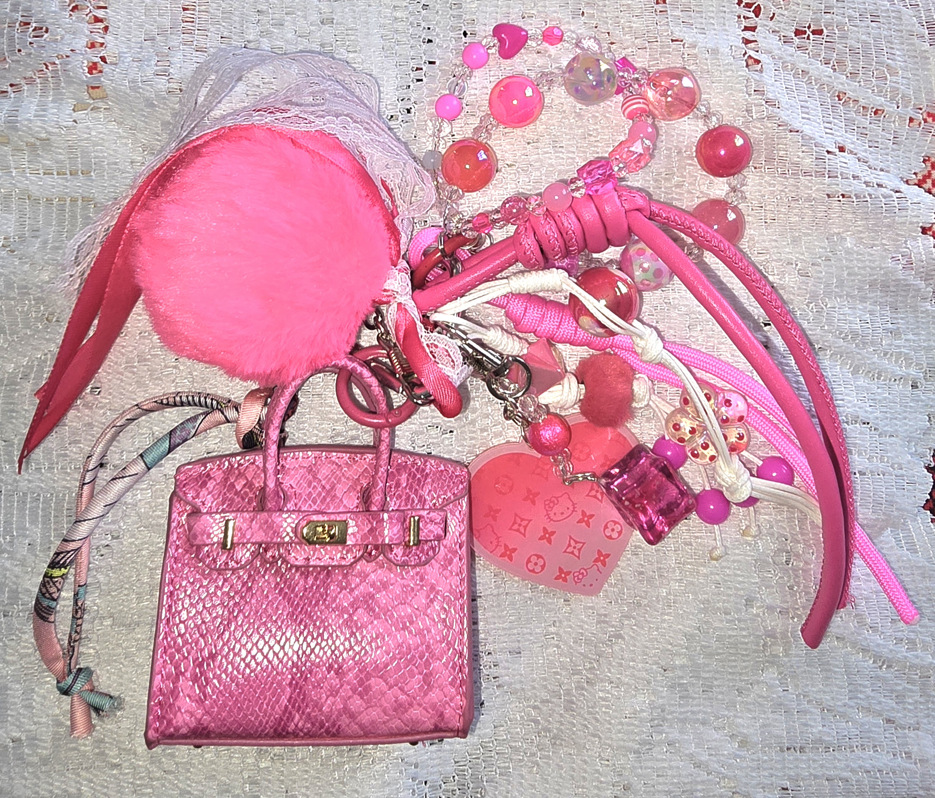 A petite pink handbag becomes the heart of a whimsical accessory constellation. Its textured surface and gold clasp evoke vintage elegance, while the surrounding charms and trinkets transform it into a storybook talisman. Dangling from the bag are: