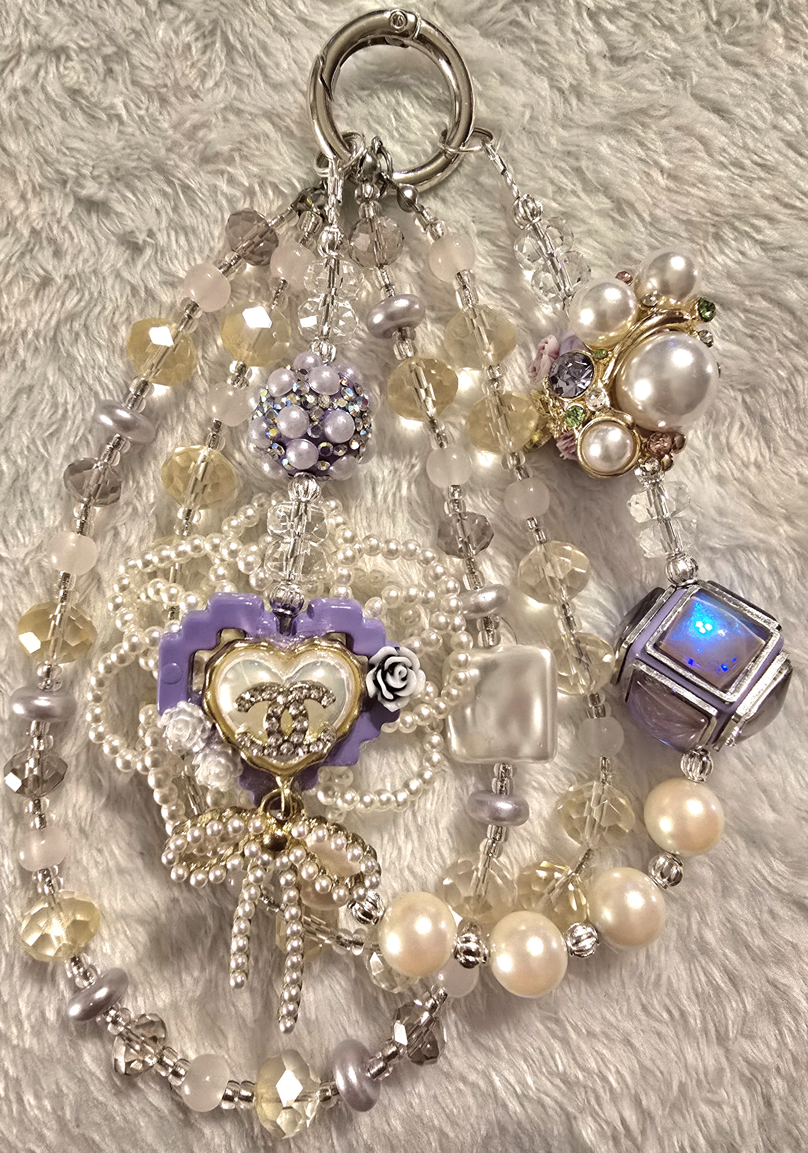 This piece blends classic luxury (pearls, CC) with whimsical and tech-inspired elements (glowing charm), making it ideal for someone who loves mixing tradition with playful innovation. It would fit beautifully in a curated collection themed around “Modern Fairytale” or “Glamour Remix.”