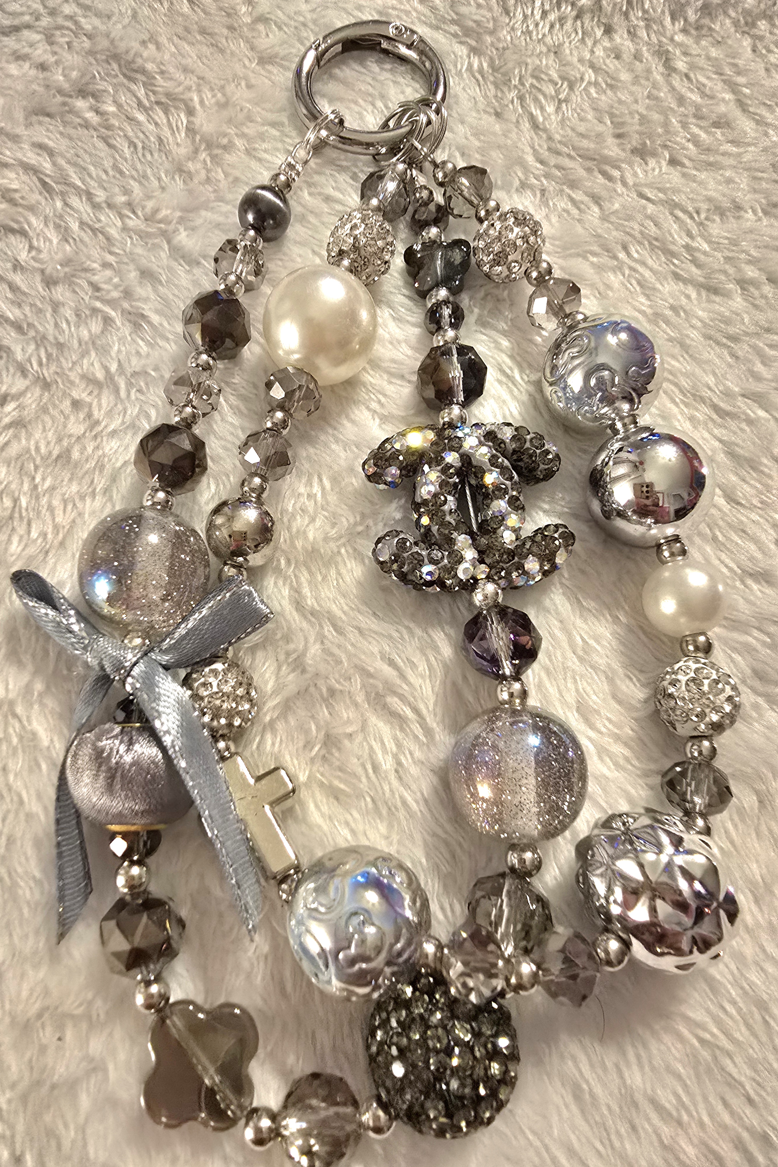 - A silver cross charm and a ribbon bow, introducing a whimsical, romantic flair
