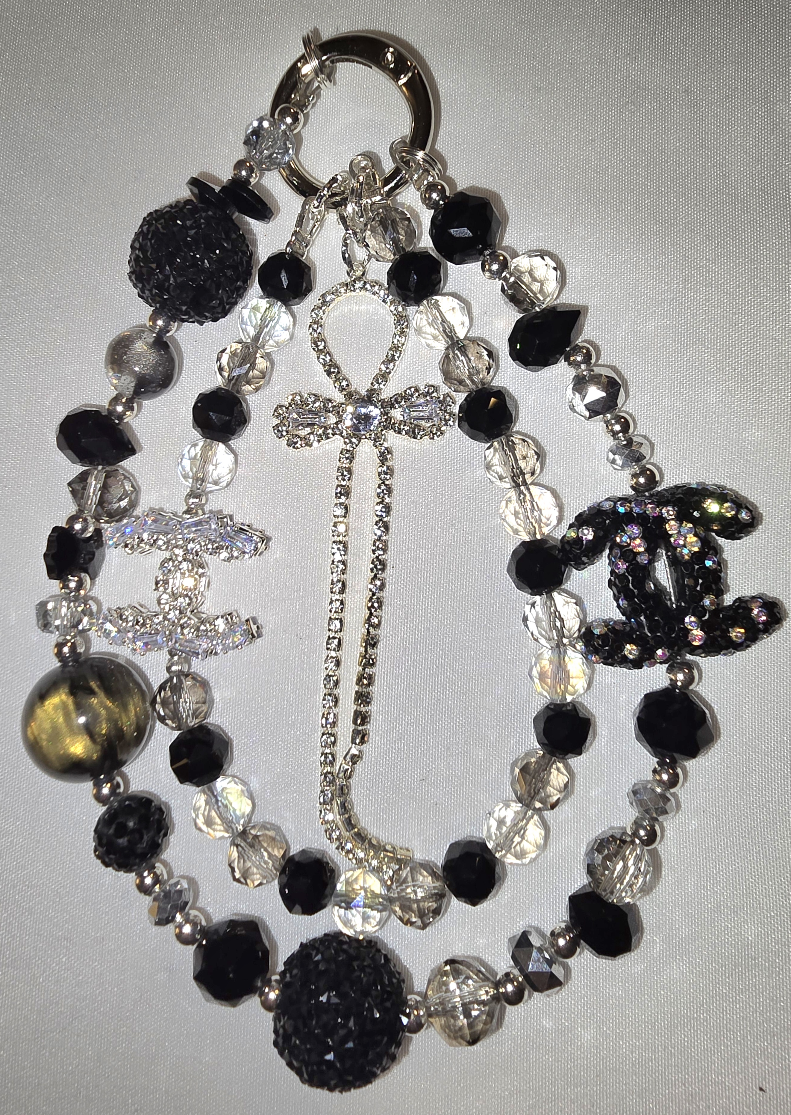 This accessory is a dazzling cascade of elegance and edge. Multiple beaded strands—glittering in black, silver, and crystal-clear tones—create a dramatic waterfall effect. Faceted beads catch the light like tiny disco balls, while metallic accents add polish and structure. The centerpiece charms steal the show: