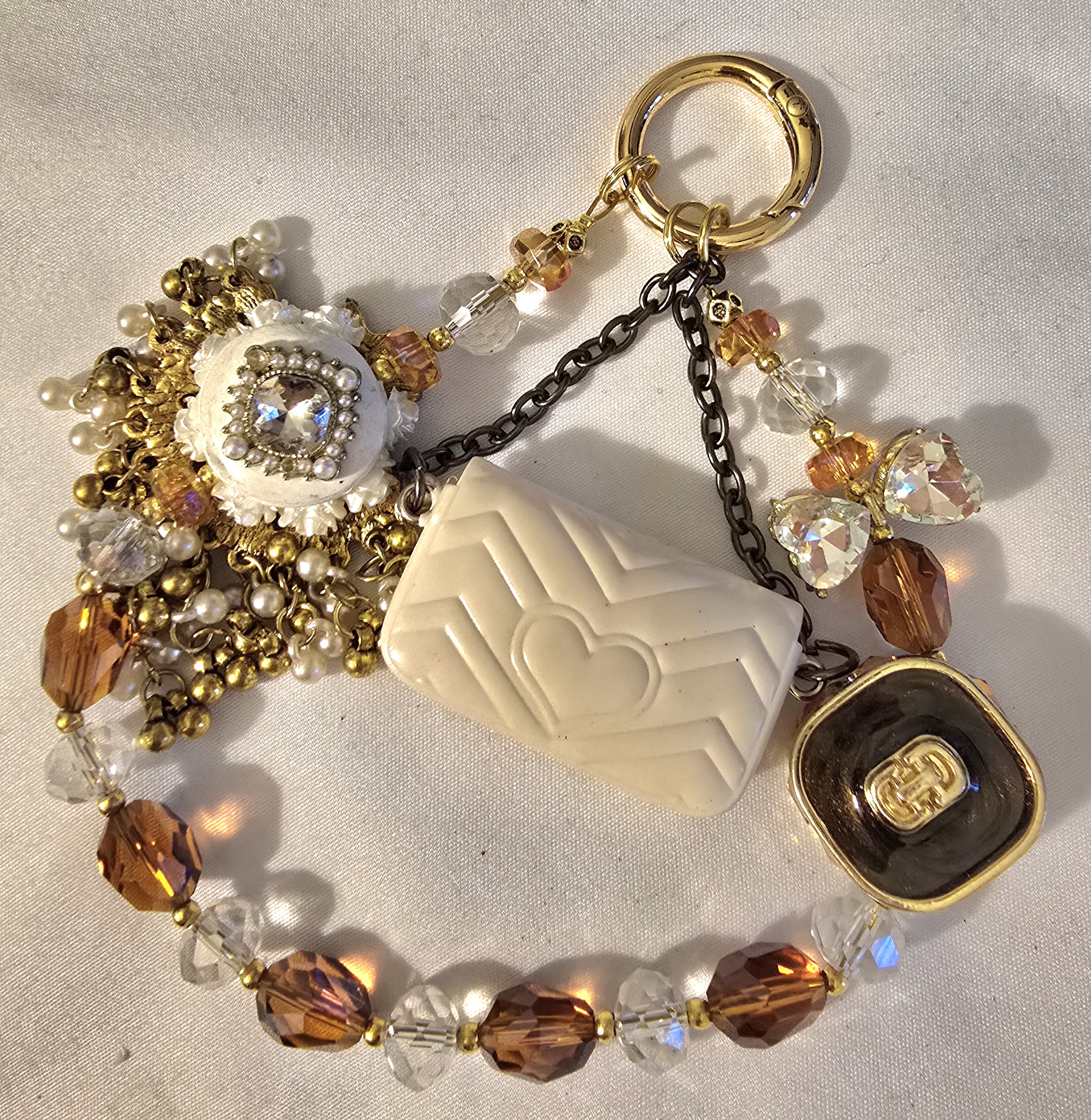 👜✨ This eye-catching chain is a curated blend of glamour and charm. It features a miniature white quilted handbag with a gleaming gold “GG” logo, exuding luxury in miniature form. Complementing it is a black-and-gold square charm, also adorned with the “GG” insignia, adding a bold accent. A dazzling crescent moon charm sparkles with white and clear gemstones, giving the piece a celestial touch. The golden chain links these charms with an elegant mix of amber, clear, and gold beads that shimmer in the light. All elements are suspended from a polished gold keyring, making this piece a perfect fusion of fashion and whimsy.