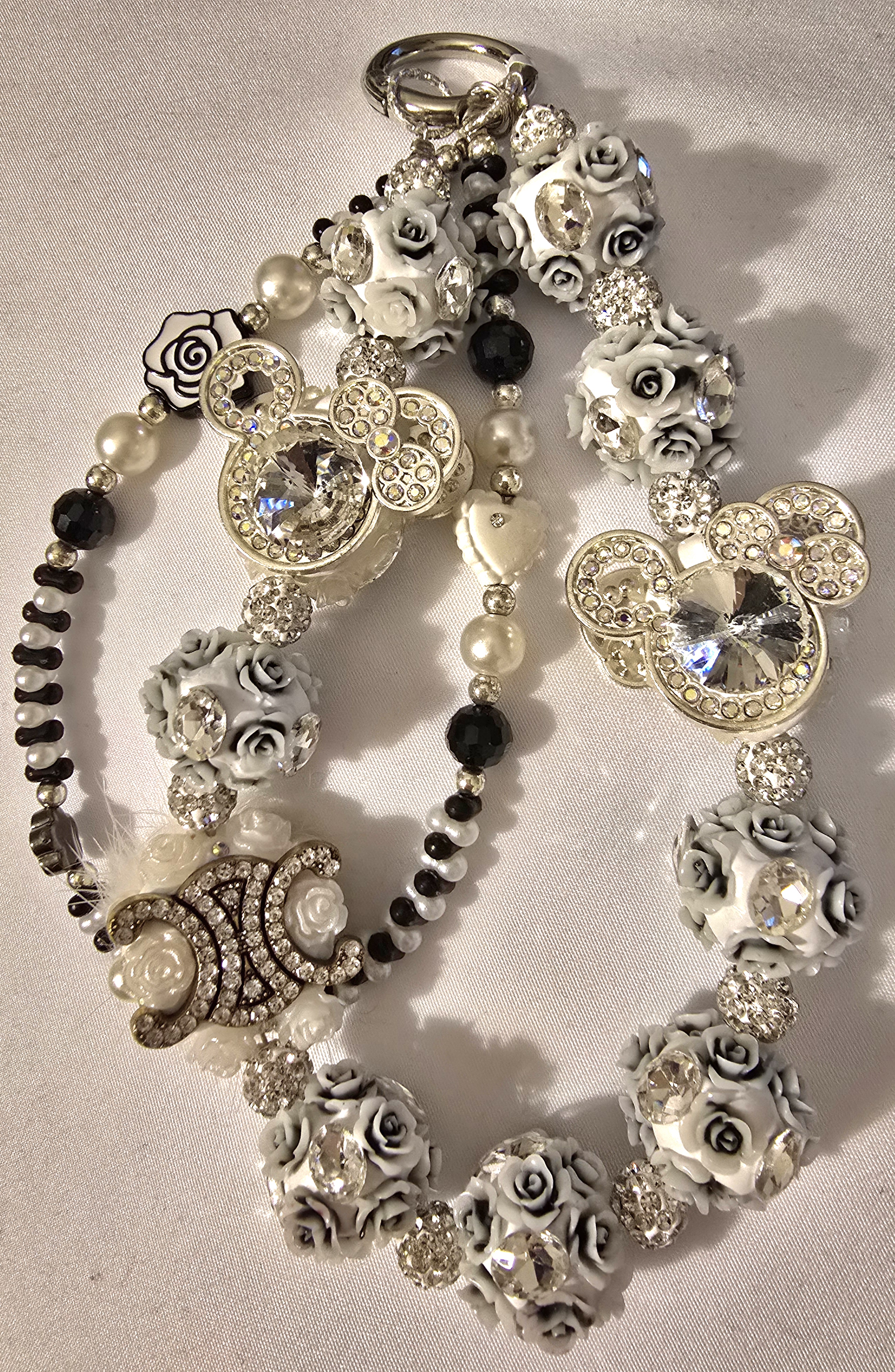 ✨ This trio of bracelets is a whimsical symphony of elegance and charm. Each piece is meticulously composed with alternating black and white beads, faux pearls, and sculpted white roses that evoke a romantic, vintage feel. Rhinestone-studded minnie mouse head charms anchor the design with playful opulence. The central C C gem between each MM head adds a luxe focal point, while the layering of textures (smooth pearls, faceted rhinestones, and delicate florals) creates a rich, tactile experience. Altogether, the charm chain feels like heirlooms from a fantasy couture atelier—equal parts storybook and runway.