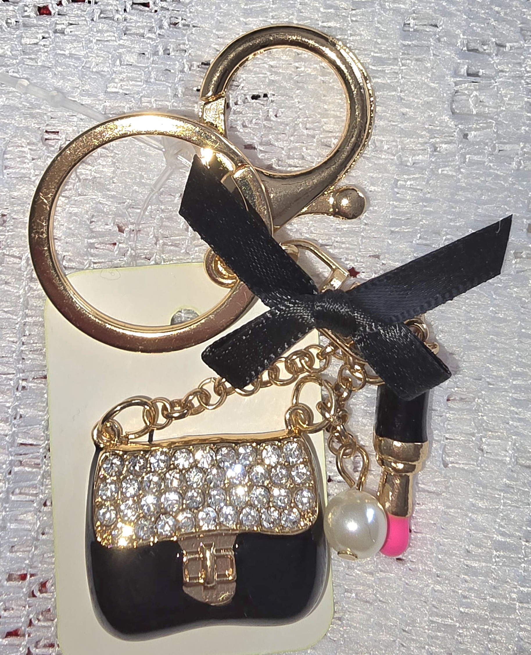 This keychain is a miniature ode to high fashion with a playful twist. Anchored by a gold-toned chain and lobster clasp, it features a dazzling lineup of charms: