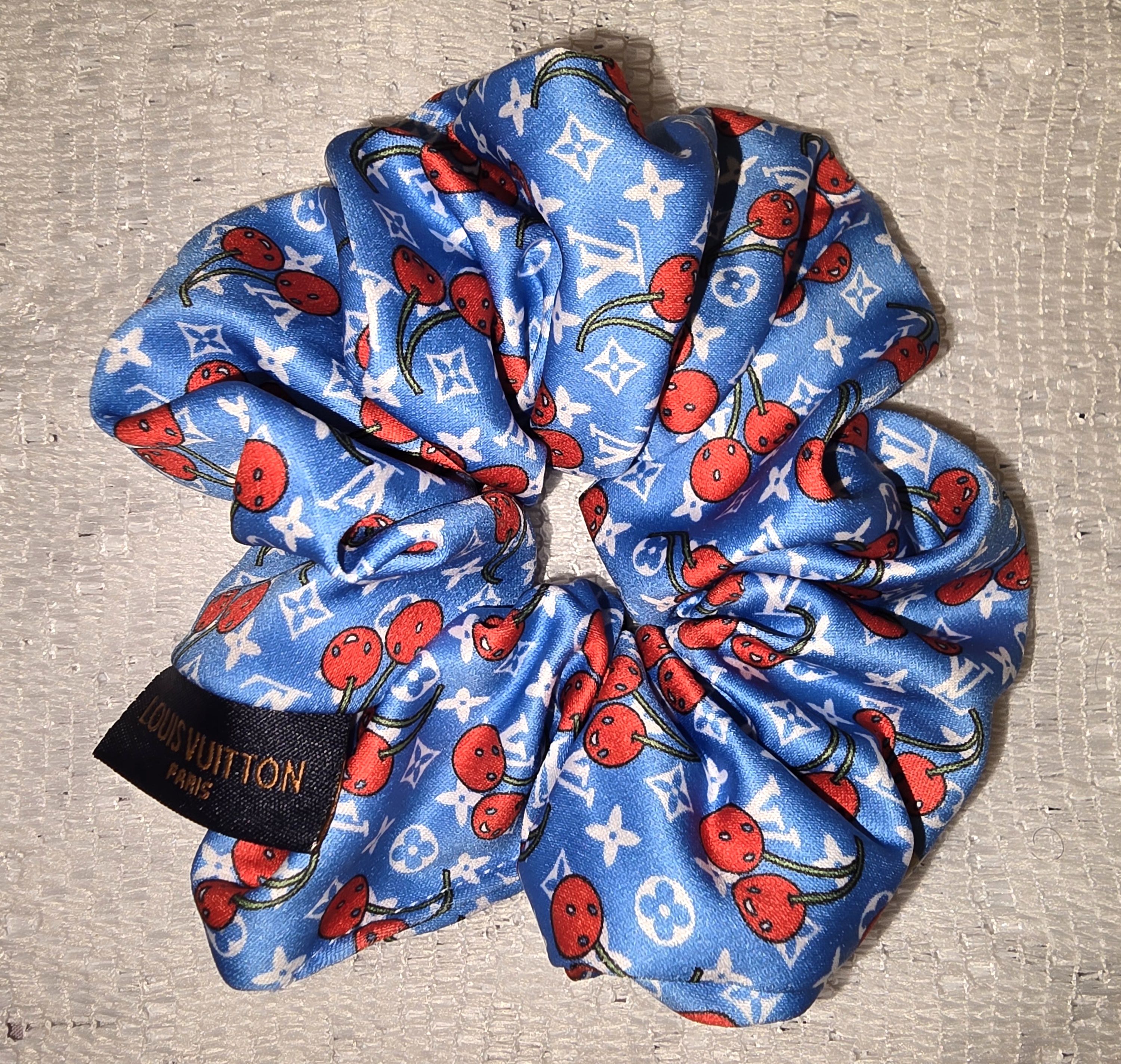 This accessory is a luxurious silk scrunchie in a rich cobalt blue, adorned with a whimsical cherry print that adds a pop of playful red. Scattered across the fabric are crisp white Louis Vuitton monogram symbols, blending iconic branding with a cheeky, youthful twist. The silk catches the light beautifully, and the black tag with gold “LOUIS VUITTON PARIS” lettering adds a final touch of elegance. It’s a perfect fusion of high fashion and fruity fun—ideal for styling with a wink.