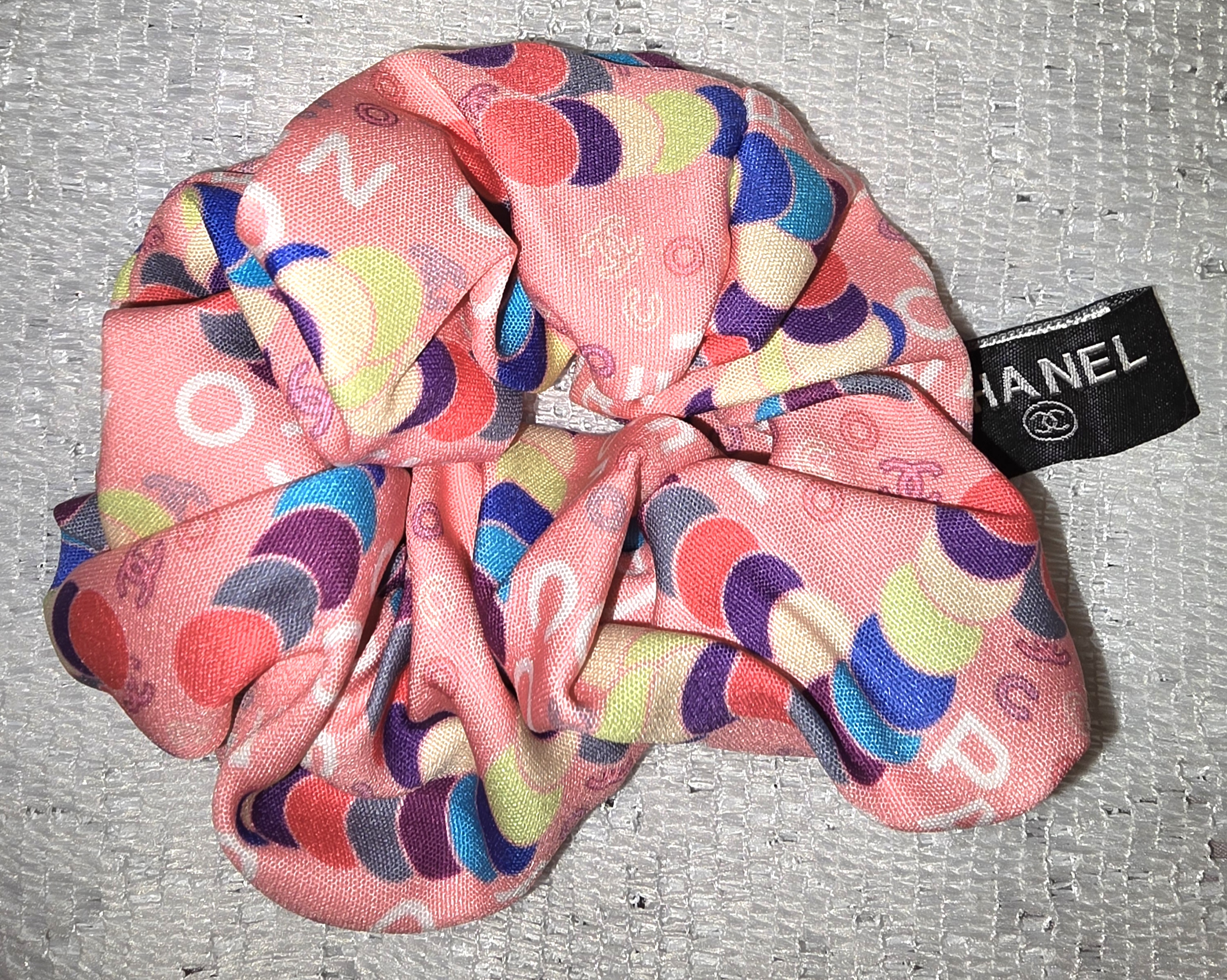 This scrunchie is a playful yet luxurious statement piece, blending high fashion with vibrant whimsy. The silky pink base is adorned with a kaleidoscope of circular motifs in red, purple, blue, yellow, and black, scattered like confetti across the fabric. White letters peek through the pattern, adding a graphic twist. The standout detail is the black fabric tag emblazoned with the iconic CHANEL name and logo in crisp white, anchoring the accessory in unmistakable designer prestige.