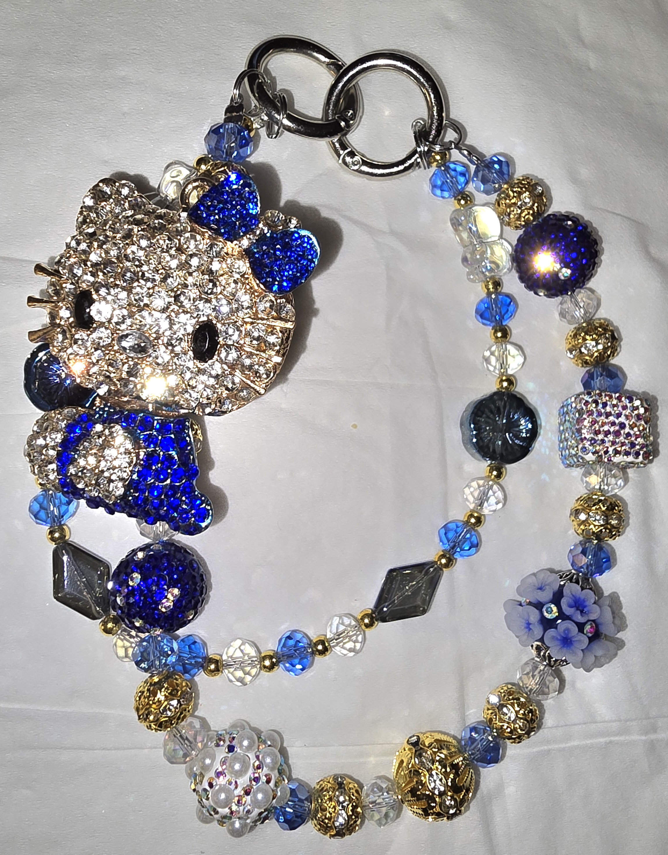 A dazzling tribute to playful elegance, this rhinestone-studded Hello Kitty charm sparkles in icy blue and crystal tones. Nestled among faceted beads, floral accents, and golden glimmers, she’s dressed to enchant—perfect for accessorizing with a wink of nostalgia and luxe whimsy.