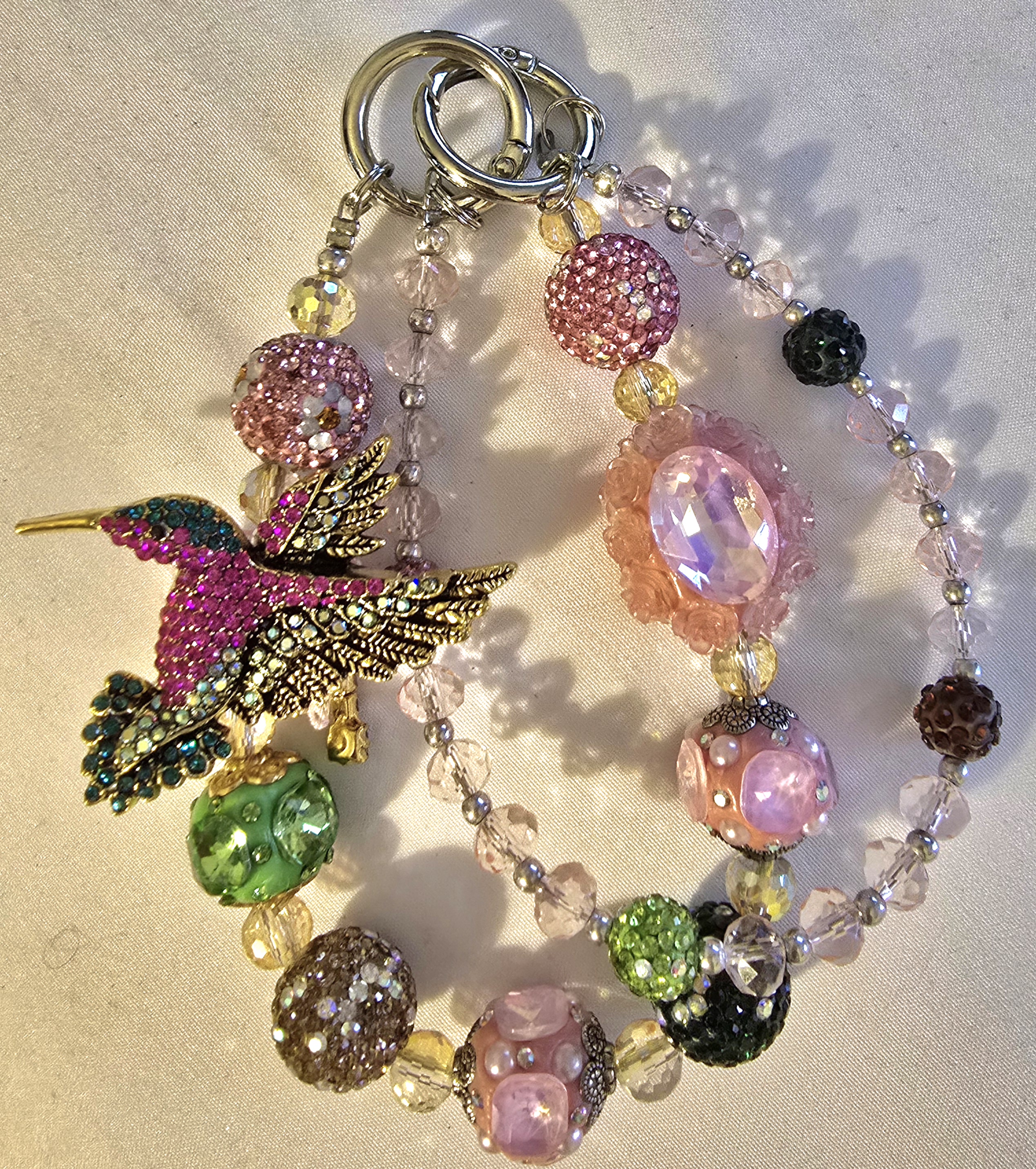 A kaleidoscope of color and charm, this handcrafted piece features a jeweled hummingbird in flight—its wings dusted with pink and sapphire stones. Nestled among a curated mix of patterned beads and crystal accents, it’s a celebration of joyful craftsmanship and wanderlust spirit. Clip it to your bag, wrist, or keys for an instant mood lift.
