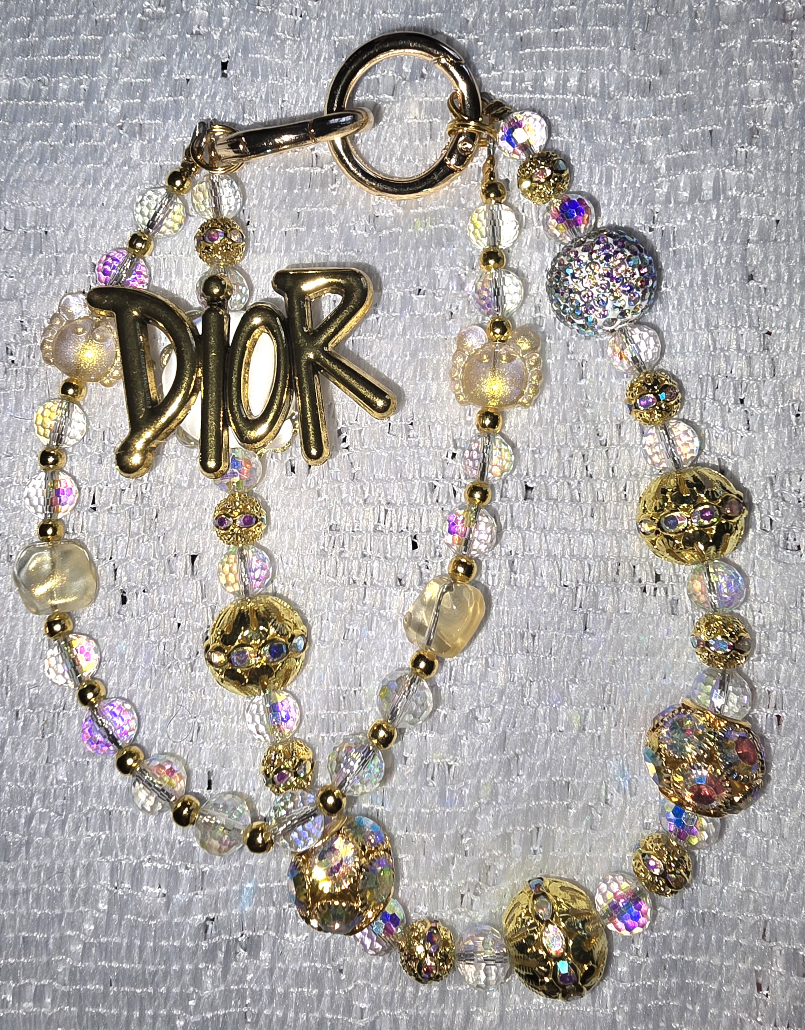 This piece is a luxurious, double-stranded accessory chain or keychain featuring a radiant gold-tone CD charm as its centerpiece. The strands are adorned with a curated mix of beads—iridescent spheres that shimmer like soap bubbles, faceted gold gems that catch the light, and clear beads flecked with glitter like stardust. Some beads are etched or embedded with intricate designs, adding texture and depth. The gold clasp and ring anchor the piece with elegance, while the overall composition evokes a sense of opulence and playful sophistication. It’s a perfect fusion of high fashion and whimsical charm—ideal for elevating a handbag, phone case, or even worn as a statement jewelry accent.