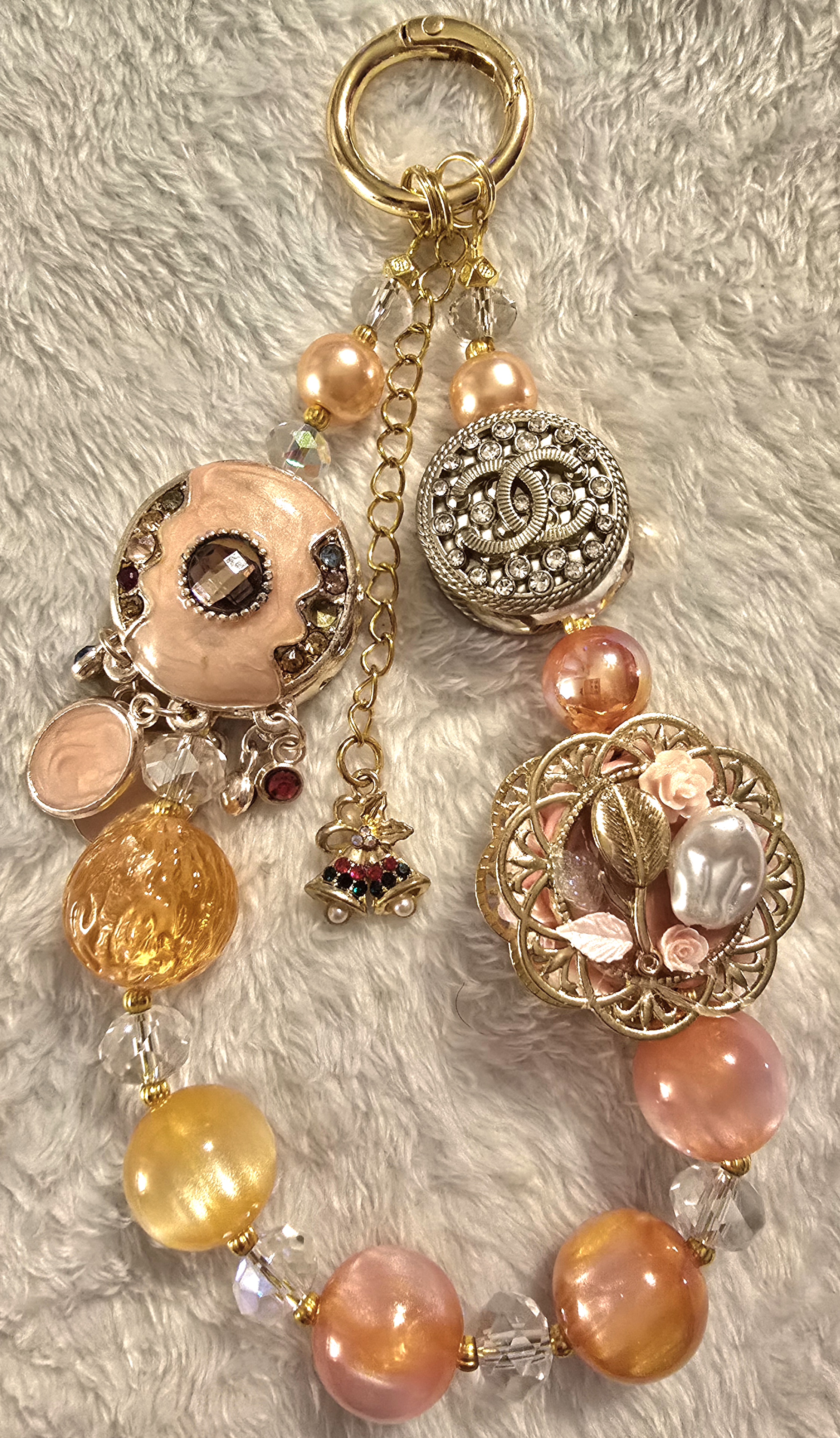 - Beads: Oversized, pearlescent spheres in blush pink and champagne gold.