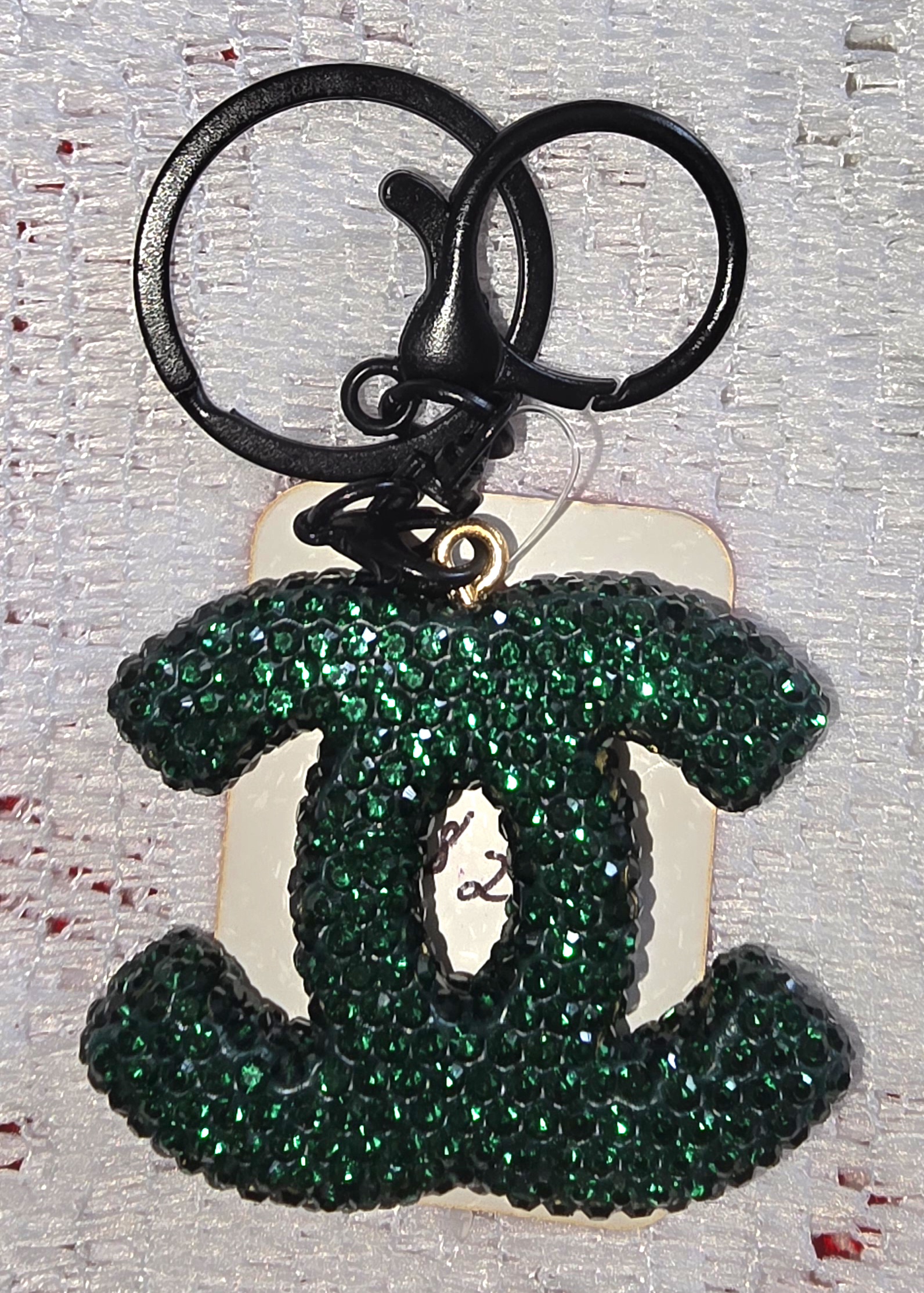 This dazzling keychain features the iconic designer logo—two interlocking “C”s—rendered in a lush emerald green and encrusted with rhinestones that shimmer like dew on velvet. The charm is suspended from a sleek black keyring and clasp, creating a striking contrast that enhances its luxe appeal. It’s a miniature statement piece, perfect for adding a touch of couture to your everyday carry. The textured white background with red stitching evokes a hint of vintage Parisian flair, making the entire presentation feel like a treasure unearthed from a designer’s atelier.