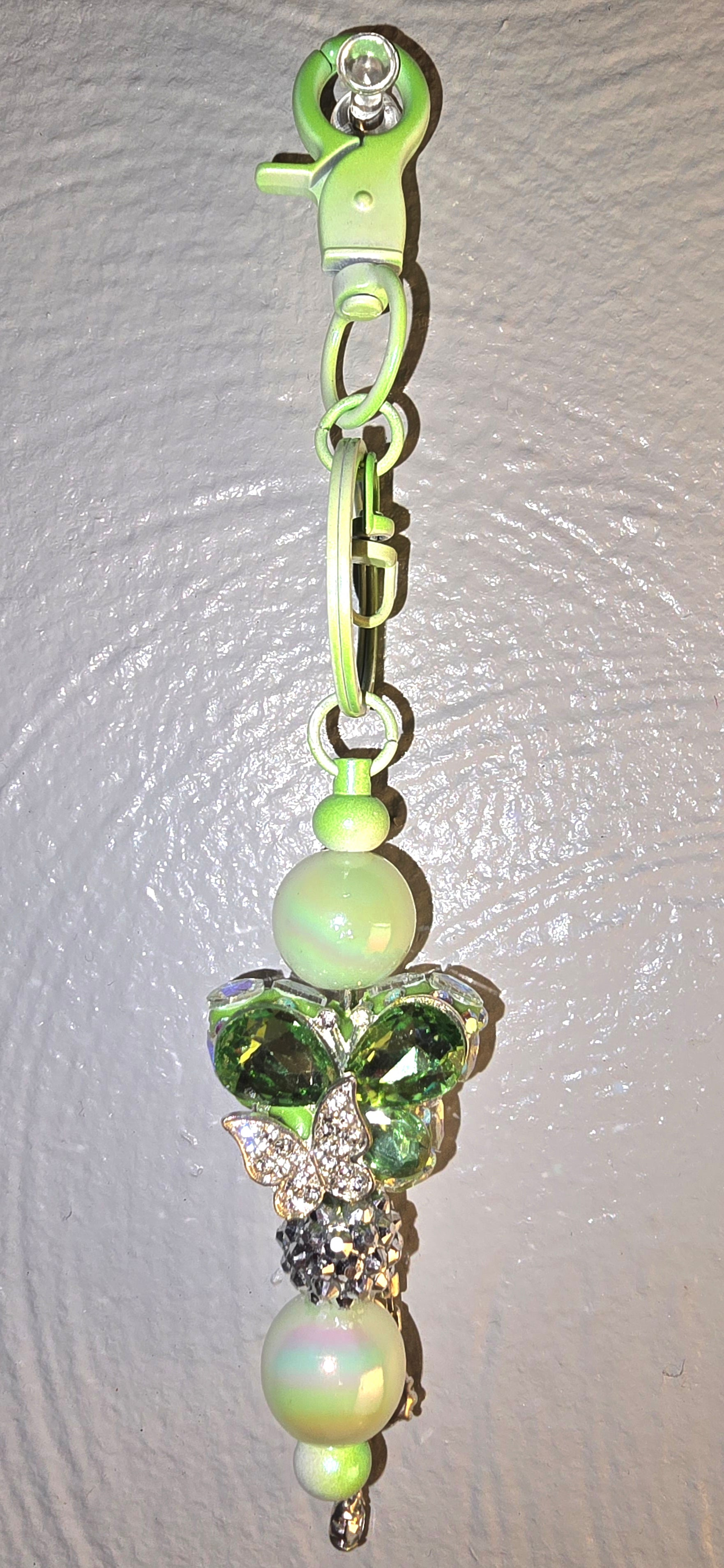 This enchanting accessory feels like a miniature fairytale frozen in motion. Suspended from a glossy green clasp, a cascade of iridescent and emerald beads leads the eye to a pair of gem-like wings—faceted and luminous like dew-kissed leaves. Nestled between them, a silver butterfly unfurls its rhinestone-studded wings, catching the light with every movement. The palette is fresh and springlike, evoking garden magic and whimsical elegance. It’s a piece that could flutter from a Parisian satchel or dangle from the wrist of a modern-day forest nymph.