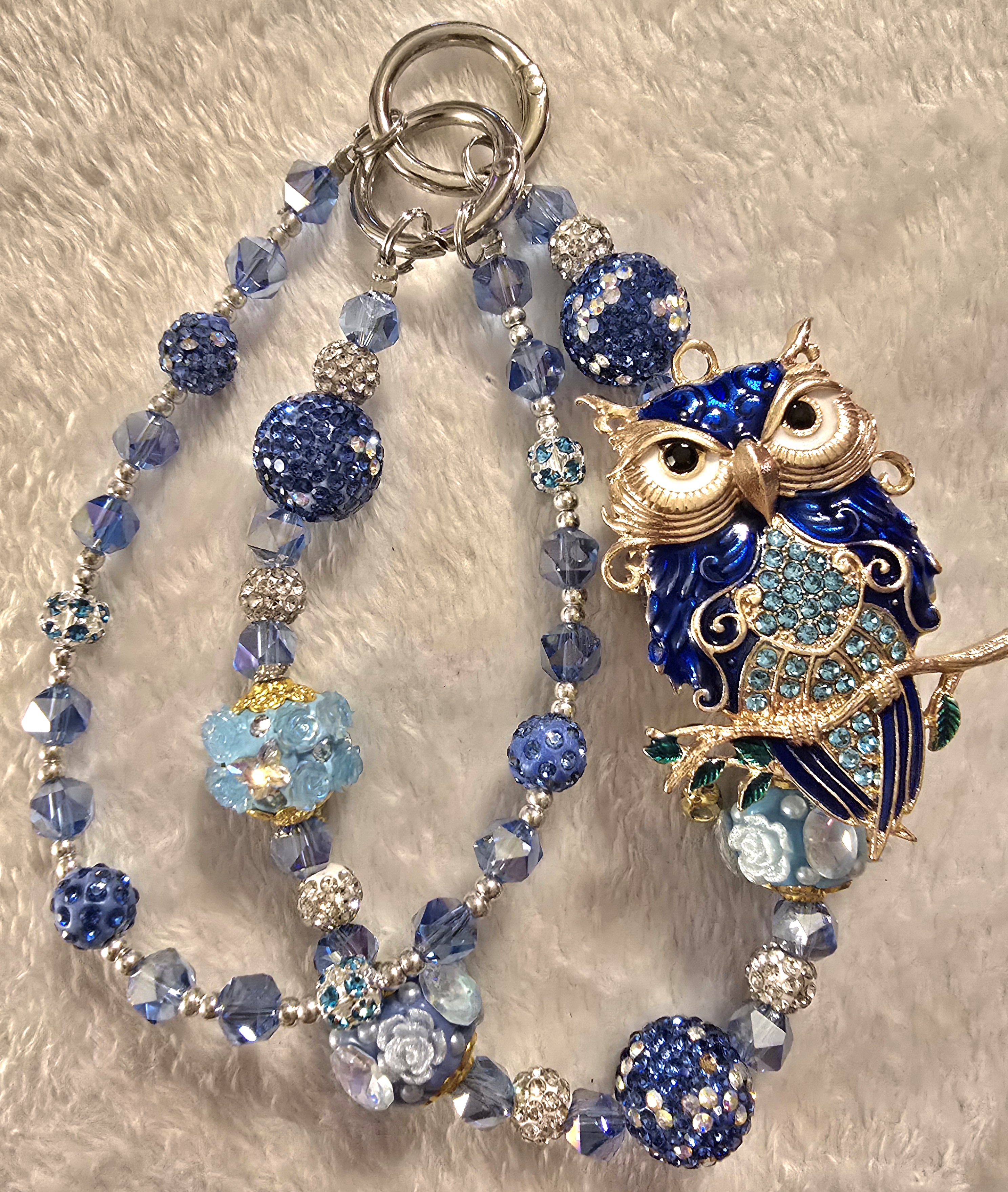 🦉 This chain is a whimsical treasure! The owl pendant steals the spotlight with its intricate detailing—blue gemstones, silver filigree, and gold accents give it a regal, almost enchanted forest vibe. The beadwork adds layers of charm: faceted blues, glittery silvers, and floral shapes that feel like a moonlit garden party.