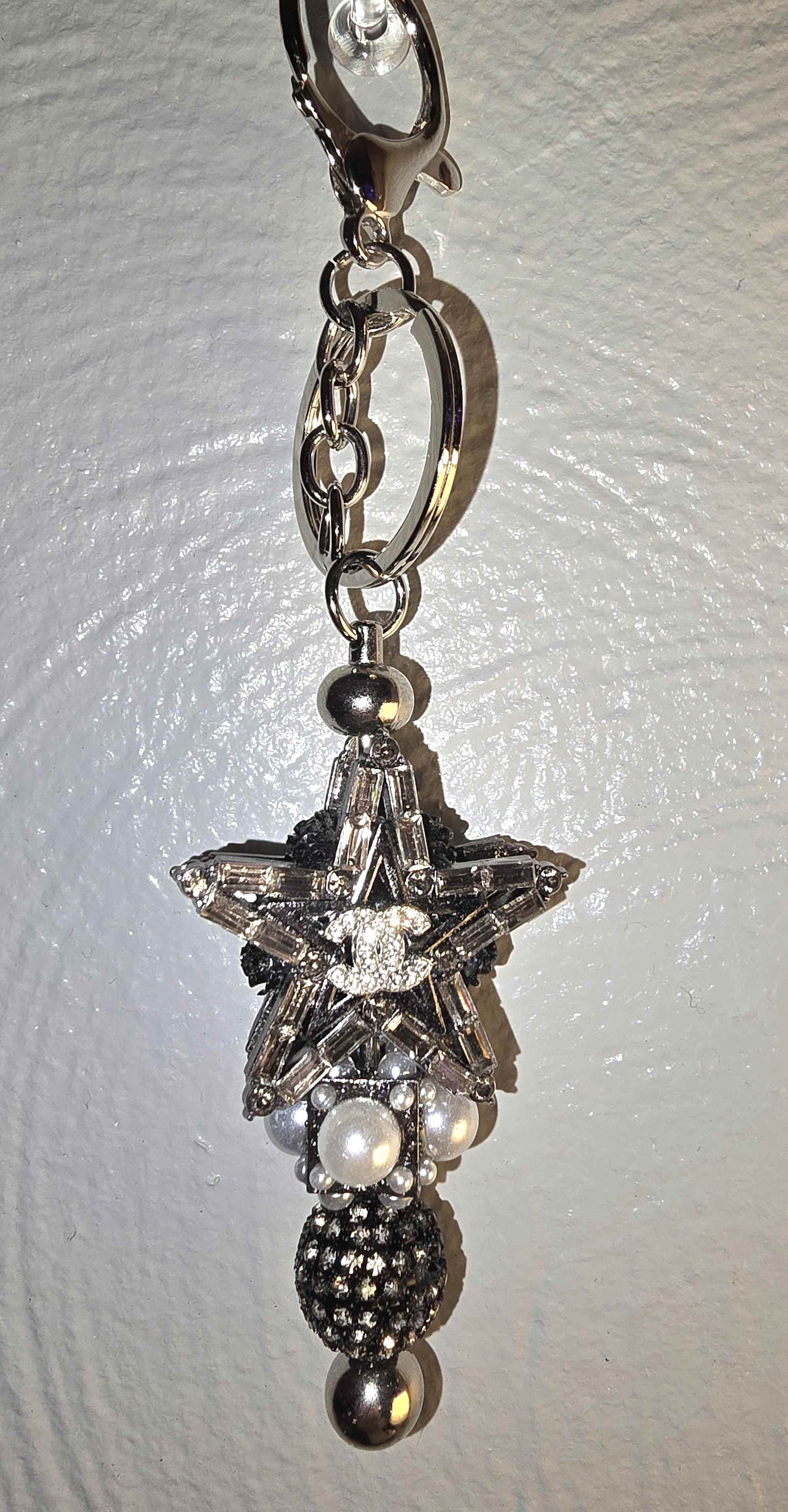 This dazzling accessory is a miniature constellation of glamour. At its heart is a starburst charm, encrusted with clear rhinestones and interlocking CC logo that catch the light like a disco ball in orbit. Suspended below are a trio of contrasting beads: a black rhinestone sphere that adds moody sparkle, a creamy pearl-like orb for classic elegance, and a petite metallic bead that ties the whole composition together with subtle shine. The textures—crystal, matte, and metal—play off each other beautifully, making it feel both celestial and couture. Perfect for adorning a handbag, clutch, or keyring, it’s a tiny universe of style.
