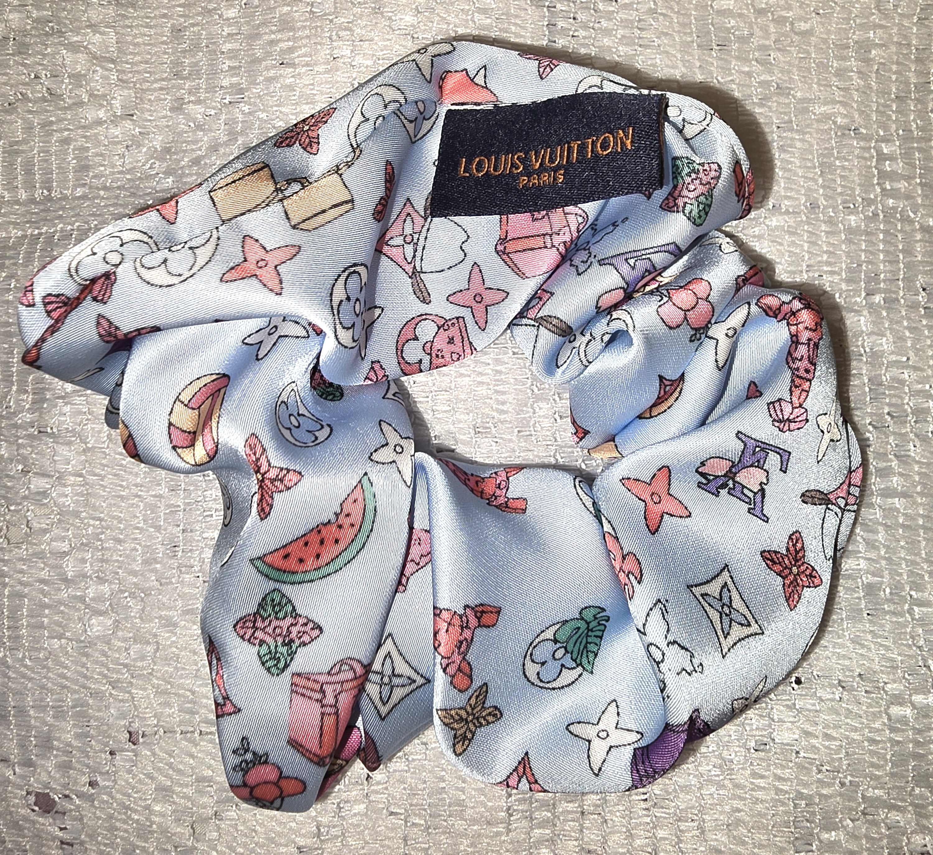 This Louis Vuitton scrunchie is a delightful fusion of luxury and whimsy. Crafted from soft light blue fabric, it features a vibrant medley of playful illustrations: juicy watermelons, blooming flowers, fluttering butterflies, hearts, gift boxes, and the iconic LV monogram. Each motif feels like a tiny celebration, evoking summer picnics, birthday surprises, and garden daydreams. The deep blue tag stamped with “LOUIS VUITTON PARIS” in gold adds a refined touch, anchoring the exuberance in classic elegance.