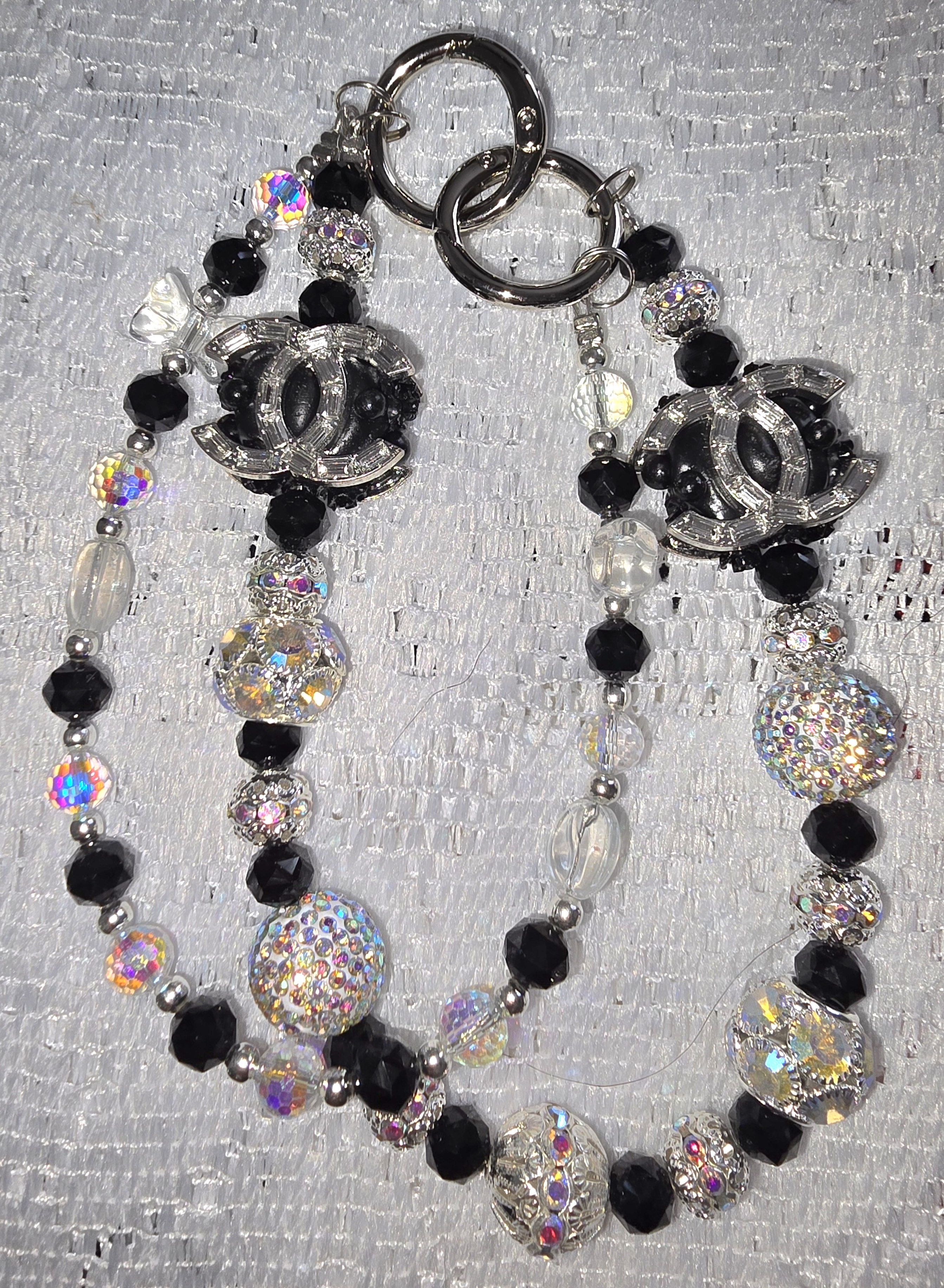 This piece is a dazzling celebration of texture and contrast. A cascade of beads—black, clear, and iridescent—creates a rhythmic interplay of light and shadow. Faceted gems catch the light like tiny disco balls, while smooth or glitter-dusted spheres add softness and sparkle. Rhinestone-studded accents elevate the glam factor, but the true showstoppers are the two silver-toned CC logo charms: bold, tactile, and unmistakably iconic. Anchored by oversized metallic rings, the piece feels both luxurious and edgy—like a couture chainmail for a bag or phone.