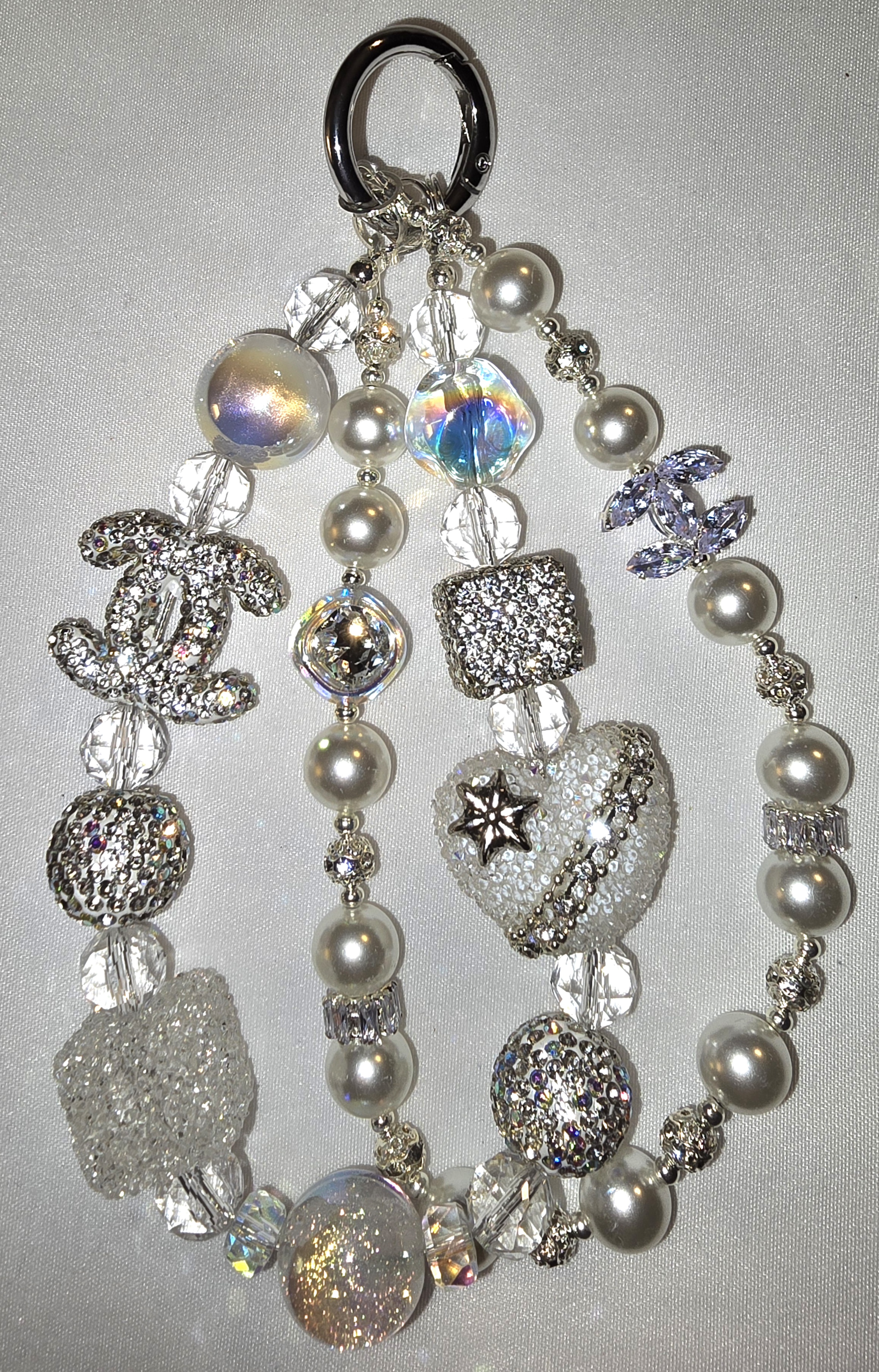 This accessory is a dazzling celebration of opulence and whimsy. Suspended from a polished metallic ring, the piece cascades into a lush arrangement of faux pearls, iridescent beads, and rhinestones that catch the light with every movement. The textures range from smooth and creamy to glitter-speckled and faceted, creating a rich visual rhythm. At its heart lies a gleaming double-C emblem designer iconic logo—instantly evoking high fashion allure. The palette leans into soft pastels and luminous whites, with hints of silver and translucent shimmer, giving it a dreamy, enchanted feel. It’s not just a keychain—it’s a miniature statement piece, perfect for adorning a designer handbag or elevating everyday essentials.
