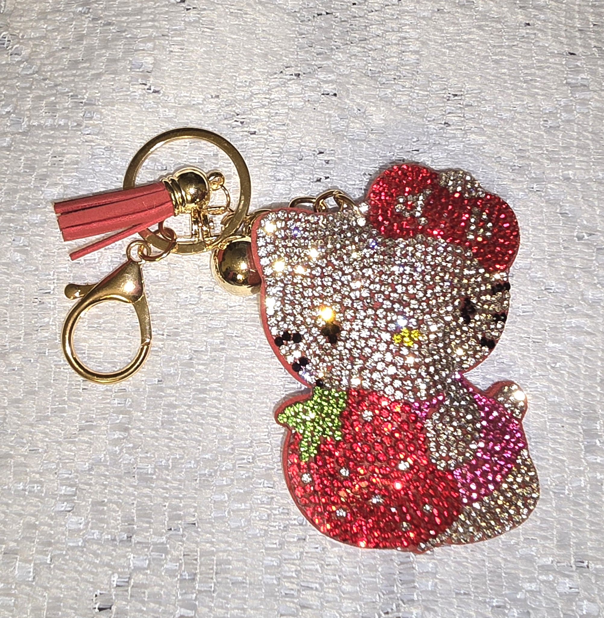 This dazzling keychain is a rhinestone-studded tribute to playful luxury. It features a Hello Kit-inspired character, her iconic silhouette rendered in shimmering crystals—silver for the face, red and pink for the outfit, and a bold red bow perched atop her head. A touch of green adds contrast to her ensemble, evoking a festive or garden-inspired flair. She hangs from a gold-toned keyring with a lobster clasp, accompanied by a soft pink tassel that adds movement and charm. The entire piece sparkles with whimsy, making it perfect for adorning handbags, backpacks, or even as a statement charm on a belt loop.