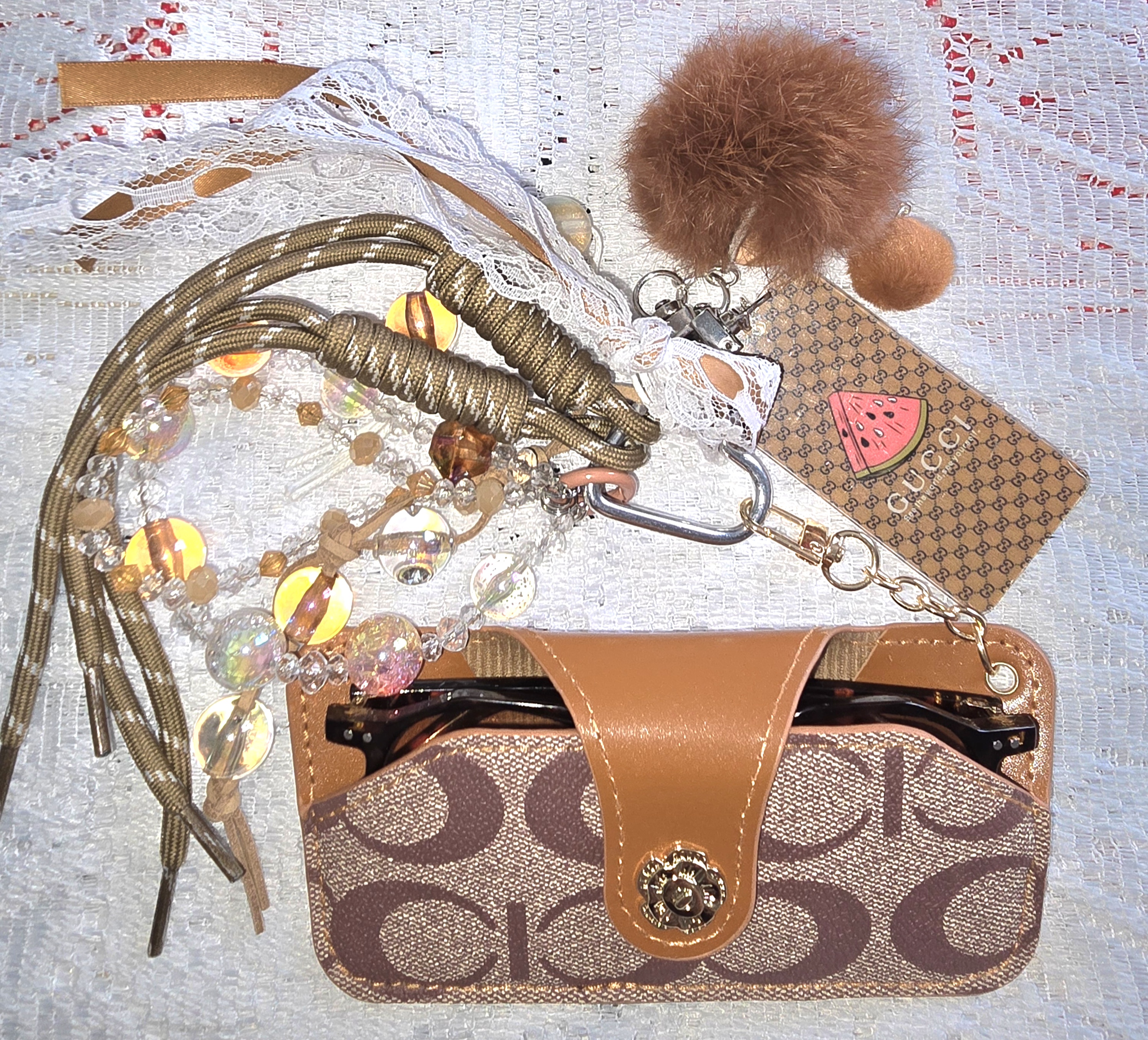 A luxe accessory vignette that feels like a secret garden tucked inside a designer’s atelier. At the heart is a classic Coach eyeglass case in signature brown monogram canvas, its gold button clasp gleaming like a vintage brooch. Peeking from within, a pair of glasses (not included) suggests intellect meets elegance. Dangling from the case is a whimsical charm cluster: a plush faux fur pom-pom in warm chestnut, a Gucci tag adorned with a playful watermelon motif, and a cascade of metallic cords, iridescent beads, and delicate lace. The beads shimmer like dew drops, catching light in soft rainbow hues. All of this rests on a lace fabric backdrop, adding a romantic, heirloom quality to the composition. It’s a fusion of heritage branding, playful charm, and intricate craftsmanship—perfect for a collection that celebrates personal style as storytelling.