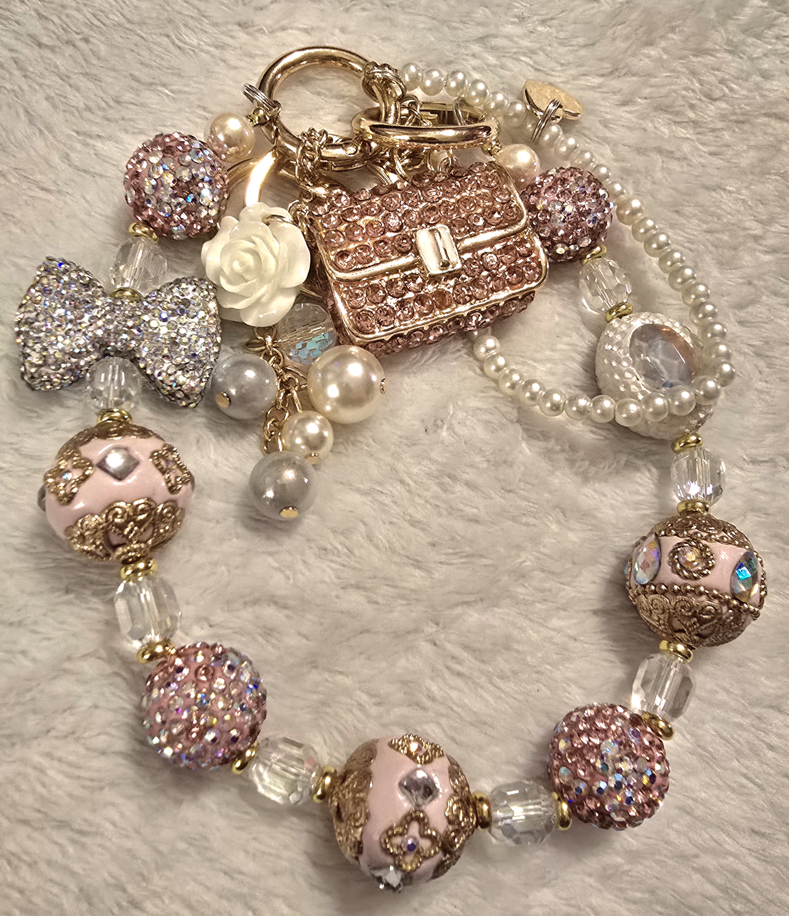 •   Miniature Handbag Keychain: A dazzling centerpiece, this tiny purse is encrusted with blush-pink rhinestones that catch the light like sugar crystals. Its petite size and glittery finish evoke the glamour of a night out in Paris, tucked into the palm of a dream.