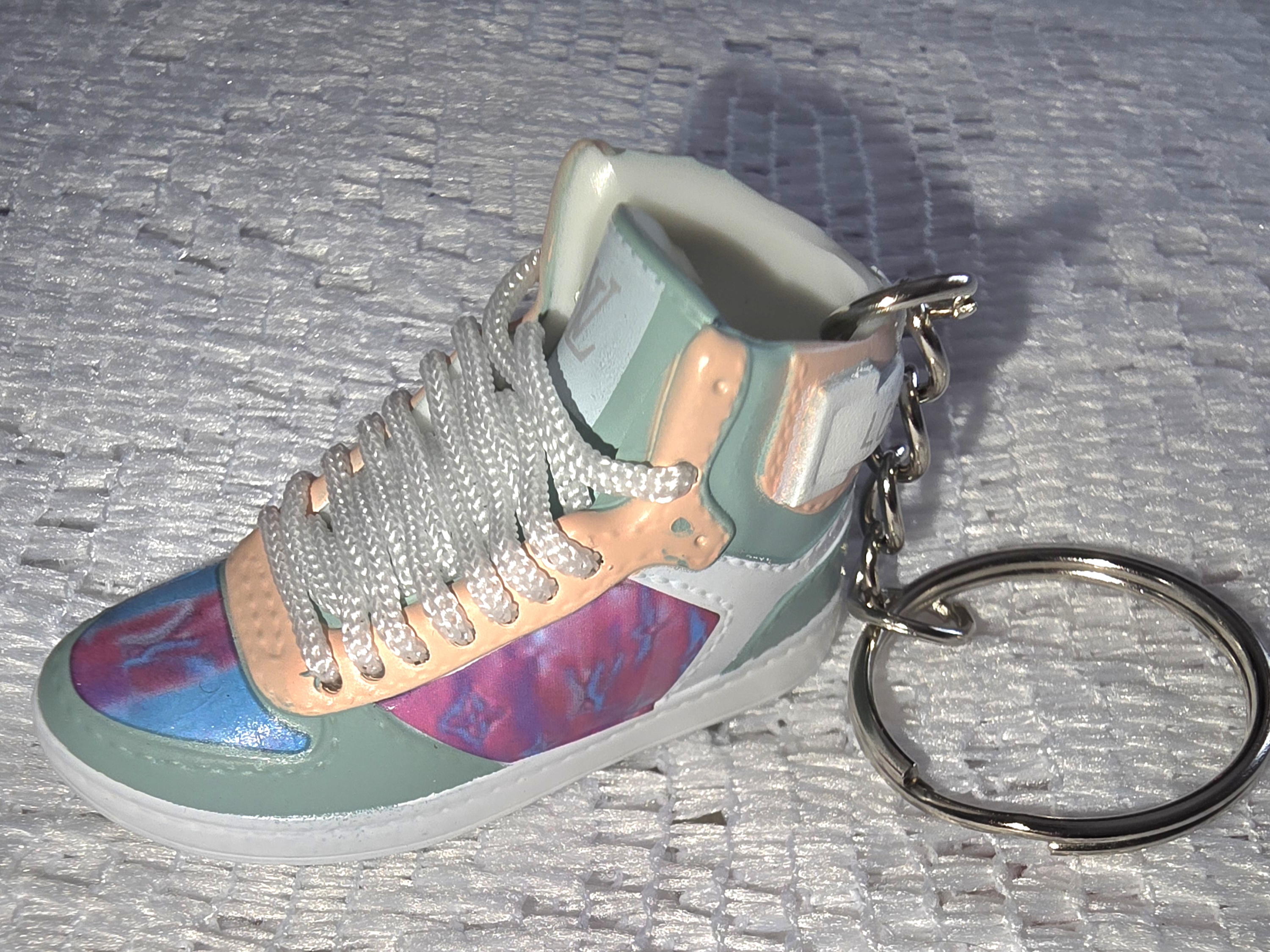 This keychain LV sneaker is a pastel dream with a playful luxury twist. It features a high-top silhouette rendered in soft mint green, peach, and white panels, accented by iridescent purple-blue overlays that shimmer like fairy wings. The stitching, laces, and tongue are meticulously detailed, echoing the craftsmanship of a full-sized designer sneaker. A silver keyring is anchored at the heel, transforming this tiny treasure into a wearable charm for bags, keys, or even jewelry. It’s sporty, whimsical, and undeniably collectible—like a couture sneaker shrunk for a dollhouse runway.