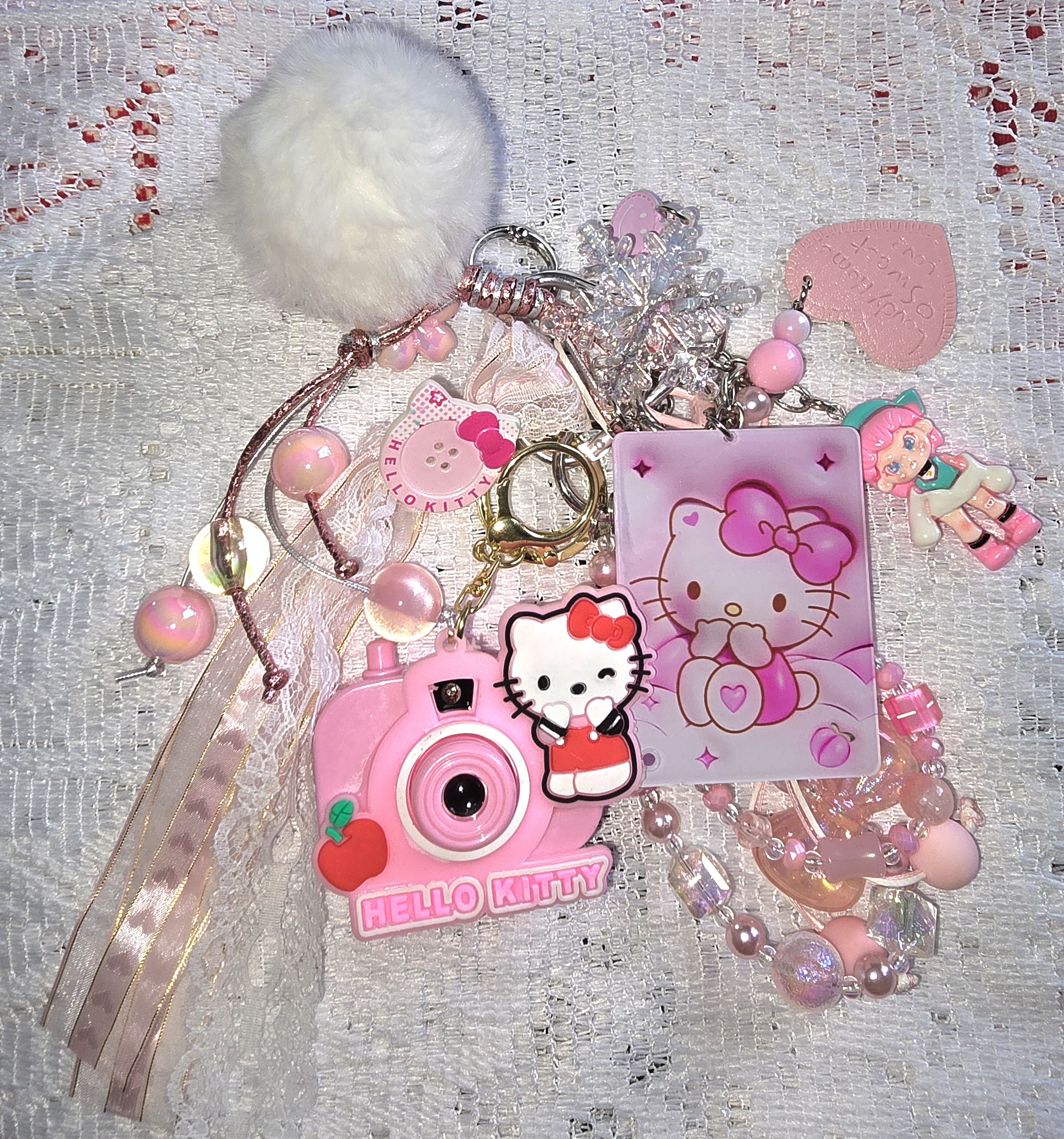 This dreamy bag chain arrangement is a celebration of playful luxury and nostalgic charm. Set against delicate white lace, the accessories form a whimsical HK vignette—where every piece feels like a character in a miniature fashion fairytale. The pink HK camera keychain (functional) steals the spotlight with its retro flair, while the fluffy pom-pom and beaded bracelet add softness and sparkle. The mix of heart-shaped tags, silver chains, and ribbon details evoke a curated collector’s fantasy, blending kawaii sweetness with designer sensibility. It’s a visual love letter to charm culture, childhood icons, and the art of accessorizing with personality.