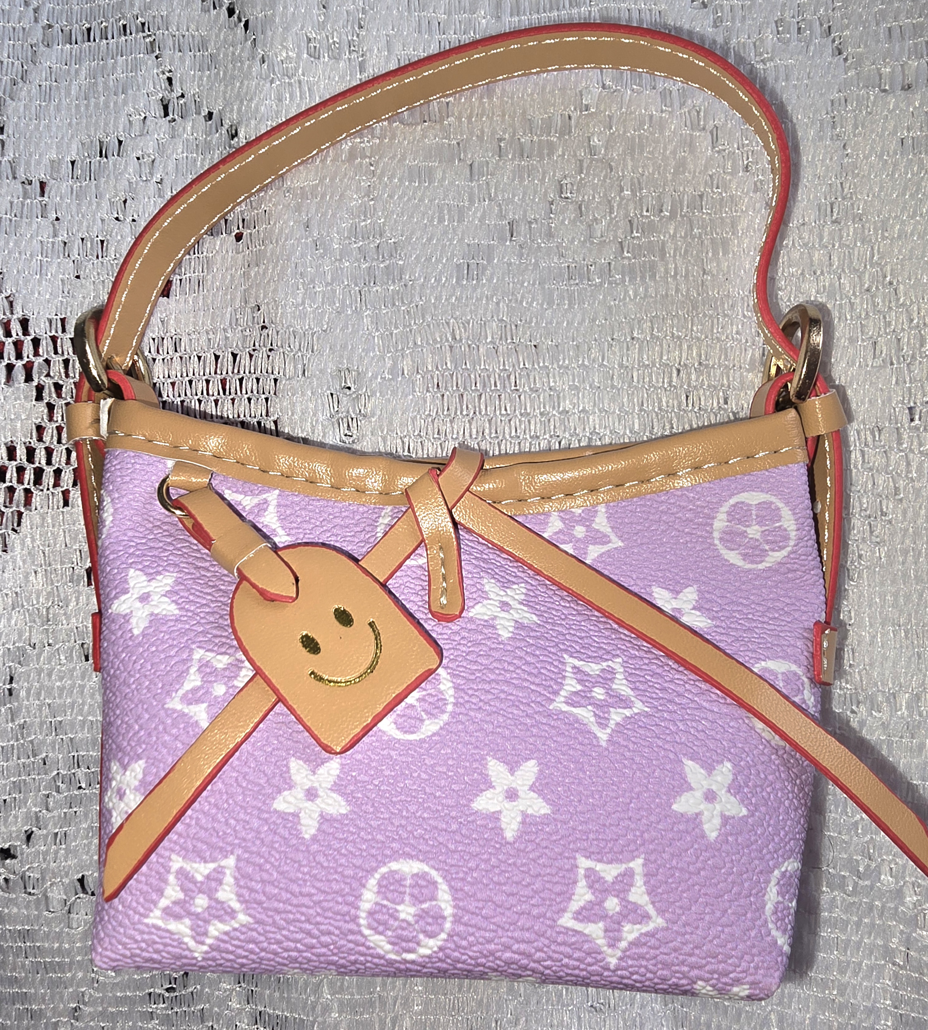 A playful twist on classic monogram elegance, this functional mini handbag features a dreamy lavender canvas adorned with white starbursts and floral motifs reminiscent of iconic patterns. Tan leather accents frame the silhouette with warmth and sophistication, while the standout charm—a cheeky smiley face tag in matching leather—adds a dose of joyful whimsy. Finished with a structured top handle and delicate stitching, it’s a celebration of charm, craftsmanship, and personality.