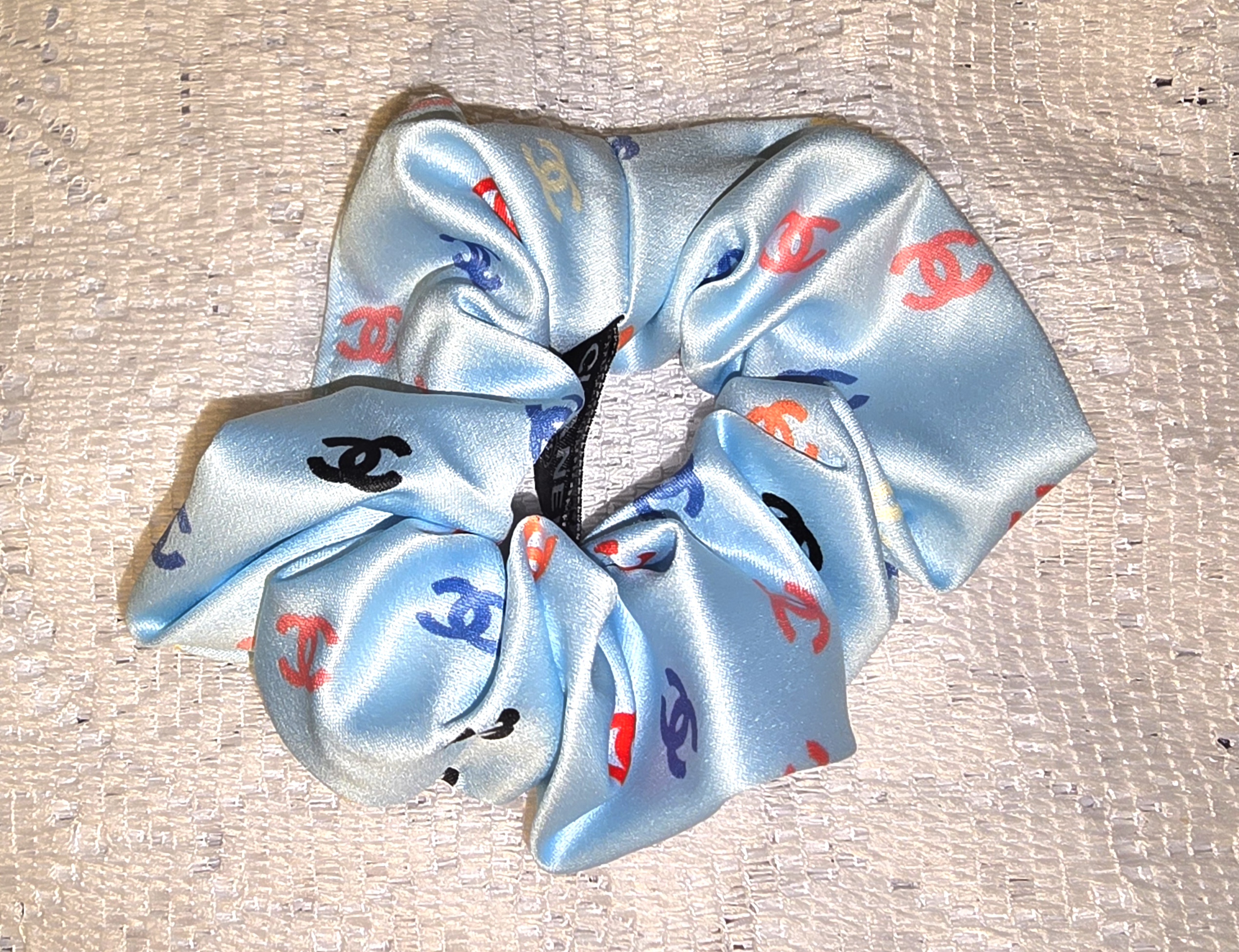 This accessory is a light blue satin scrunchie that radiates playful luxury. Its silky fabric catches the light with a soft shimmer, while a scattered pattern of multicolored CC logos—red, black, purple, and orange—adds a bold, branded flair. The interlocking C’s evoke iconic fashion heritage, yet the rainbow palette and gathered silhouette keep it youthful and whimsical. It’s a perfect fusion of high fashion and fun, ideal for elevating everyday hairstyles with a wink of designer charm.