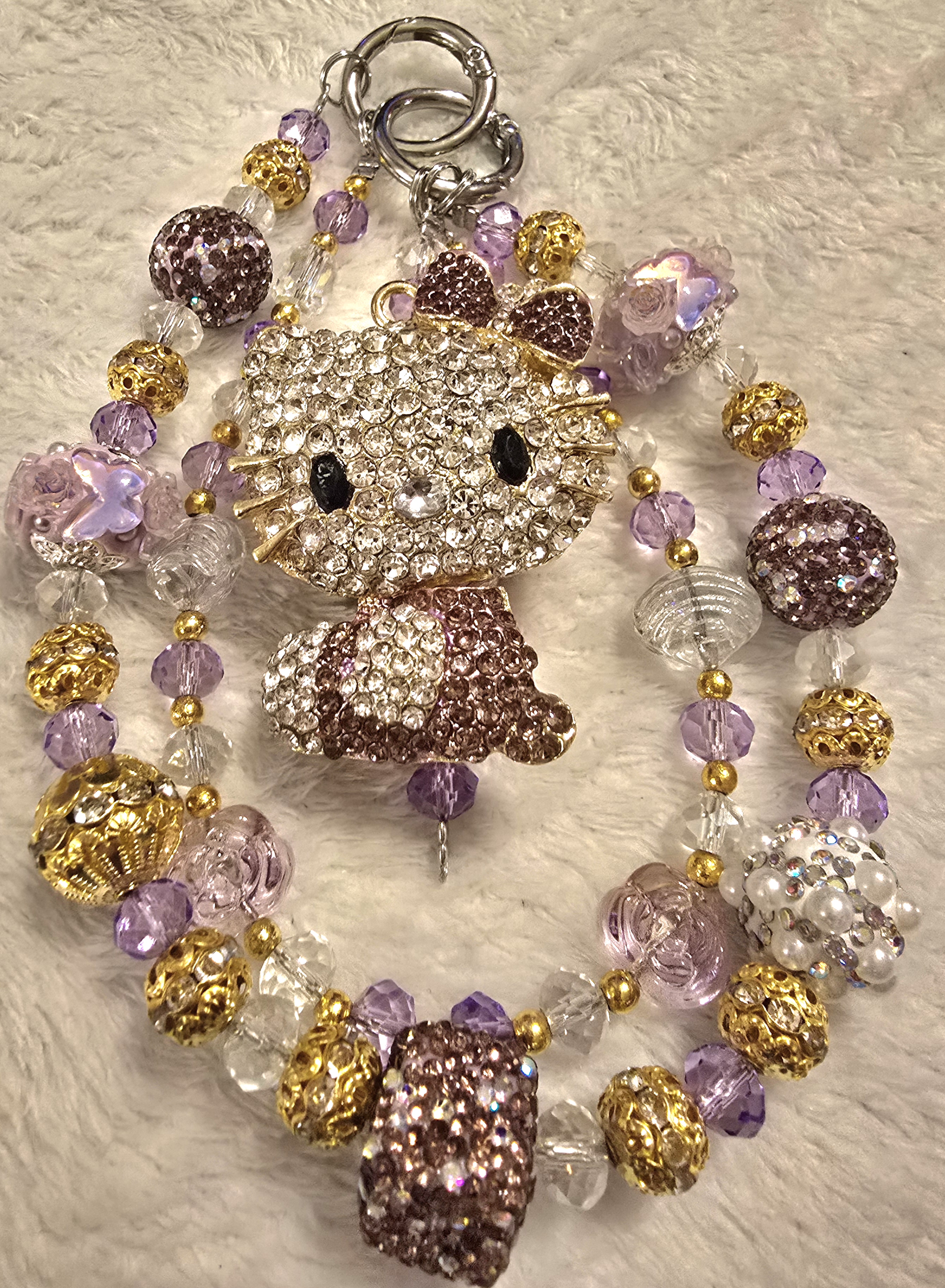 A radiant tribute to kawaii couture, this Hello Kitty chain dazzles with rhinestone brilliance and a cascade of beaded elegance. From glittering spheres to floral charms in lavender and gold, each detail whispers whimsy and wonder. Clip it to your bag or keys for an instant dose of sparkle and nostalgia.