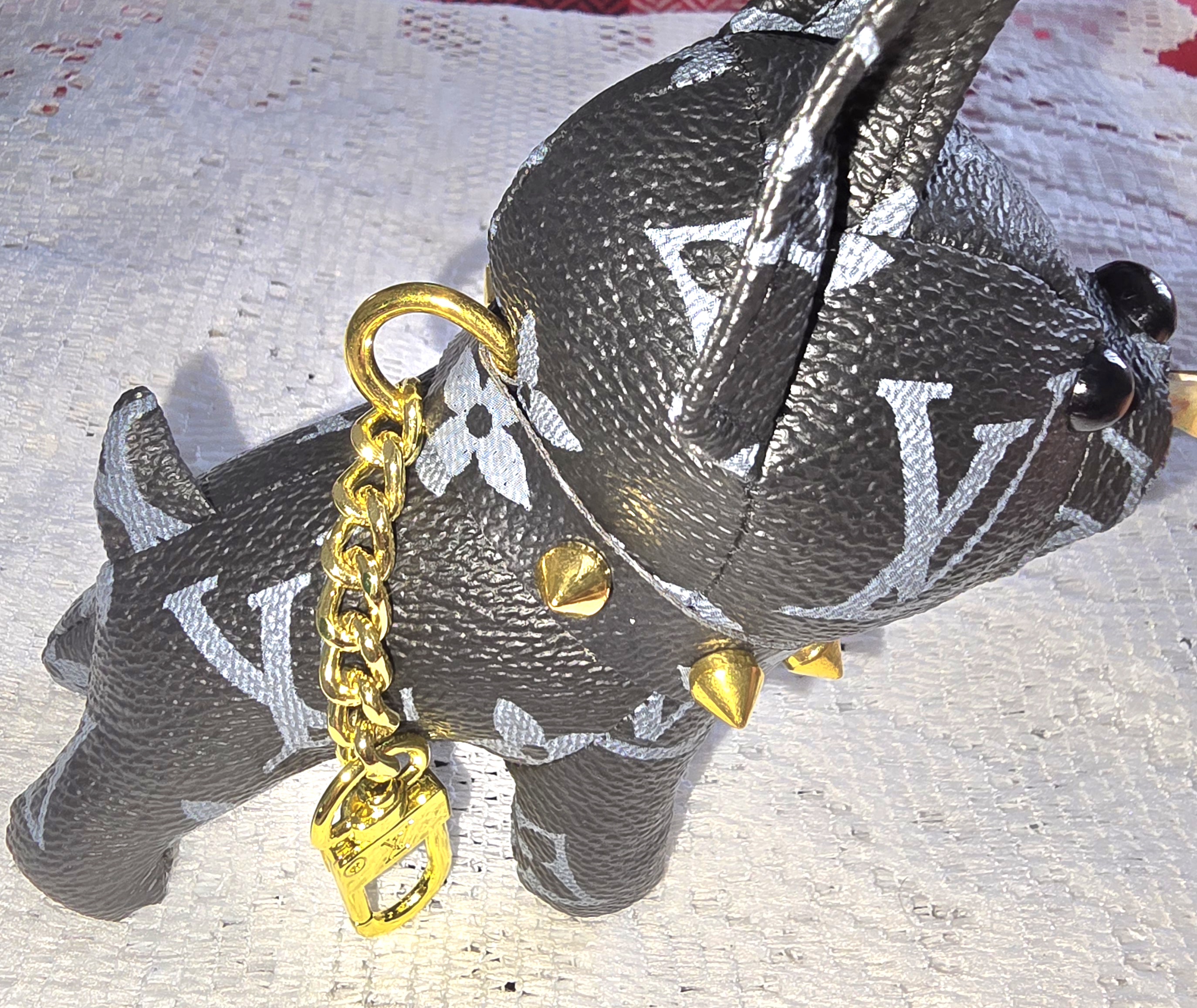 You’ve got a miniature dog figurine crafted from textured black leather material that mimics the iconic Louis Vuitton monogram canvas—complete with the floral motifs and LV initials. Its silhouette is stylized and compact, almost like a French bulldog or a pug, giving it a playful yet posh presence.