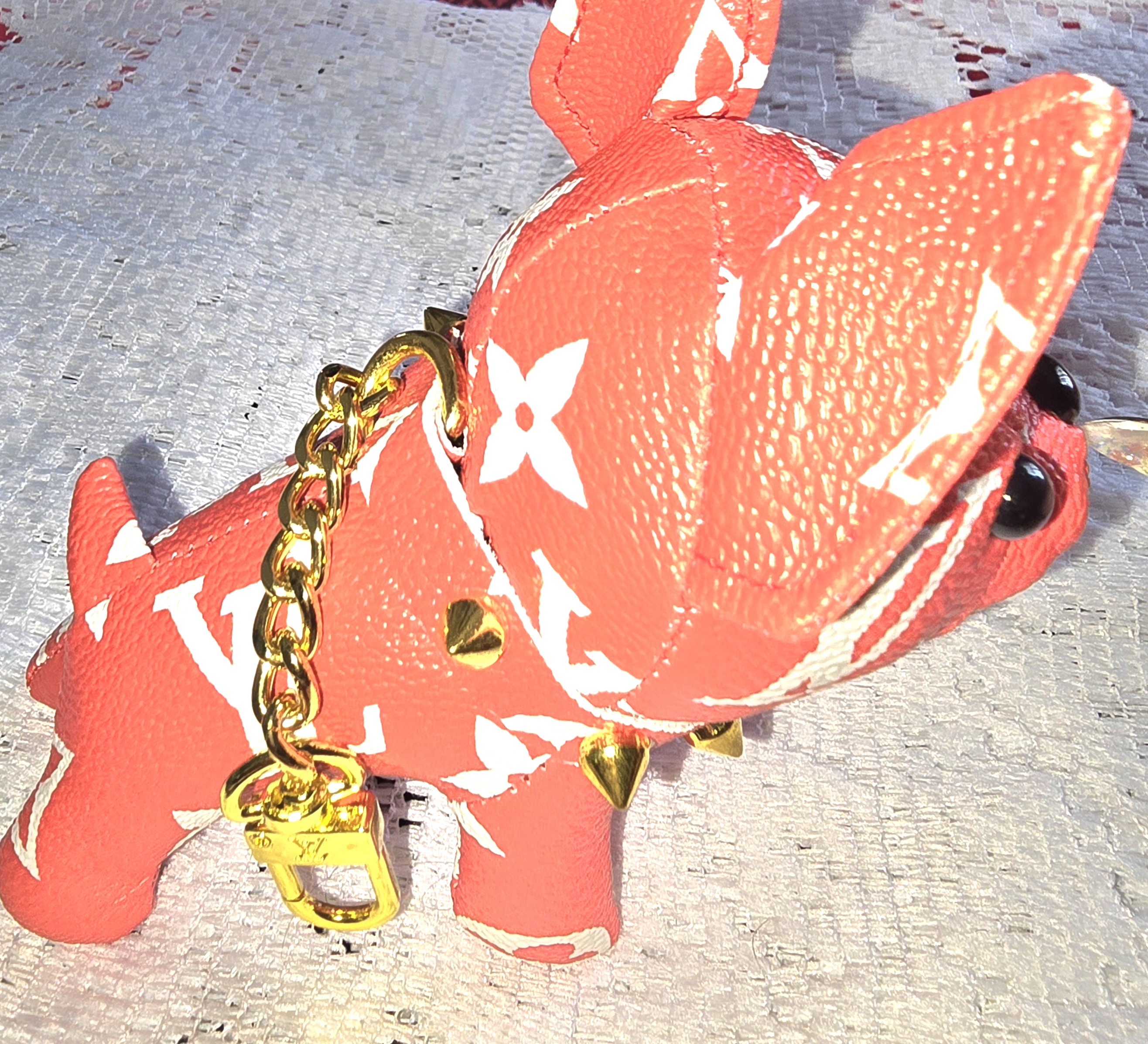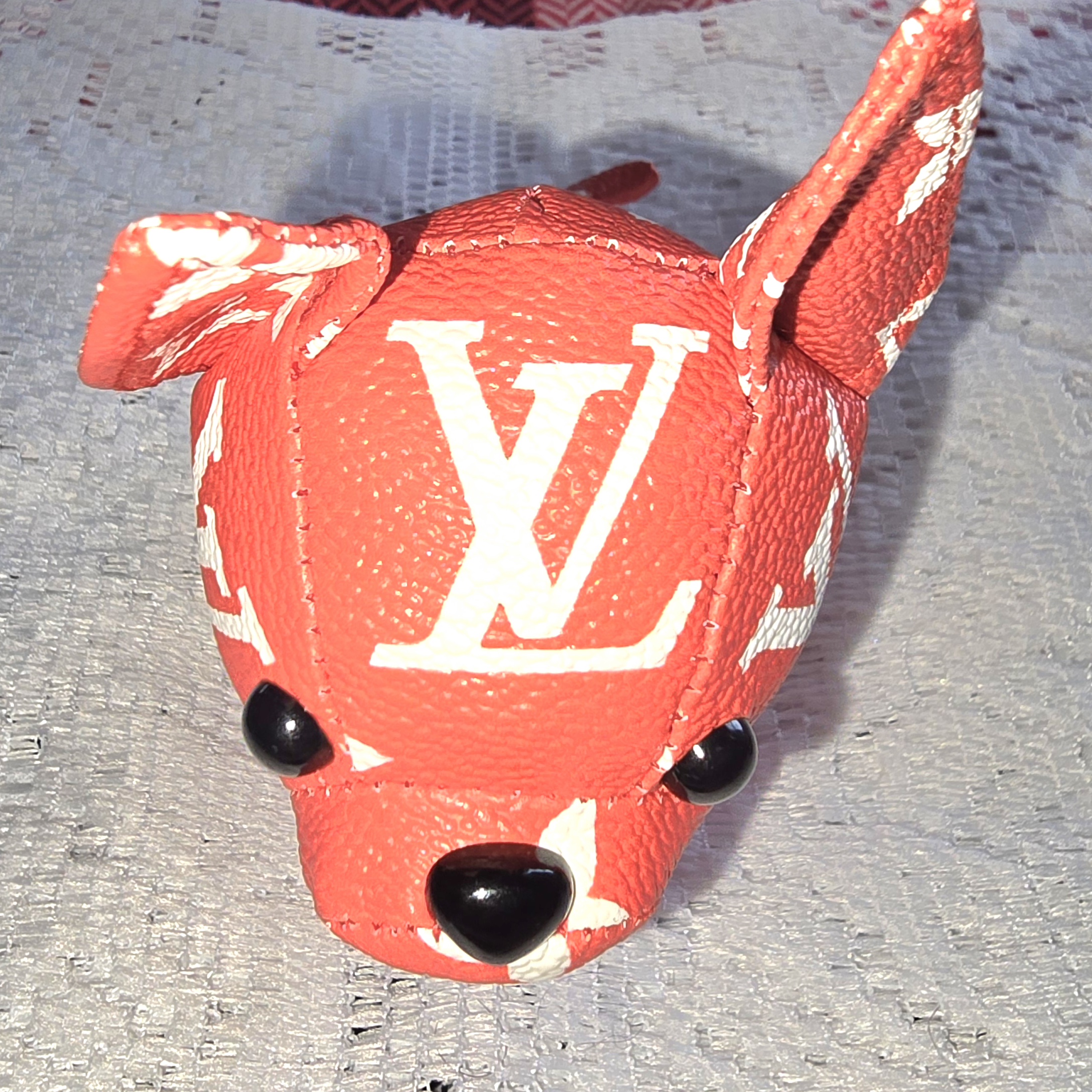 This piece is a delightful fusion of luxury branding and playful charm 🐾✨. It’s a small, dog figurine rendered in a bold red hue, adorned with a white Louis Vuitton monogram pattern that instantly evokes high fashion. The exaggerated features—oversized ears, a prominent snout, and glossy black eyes—give it a cartoonish, endearing personality, almost like a designer mascot.