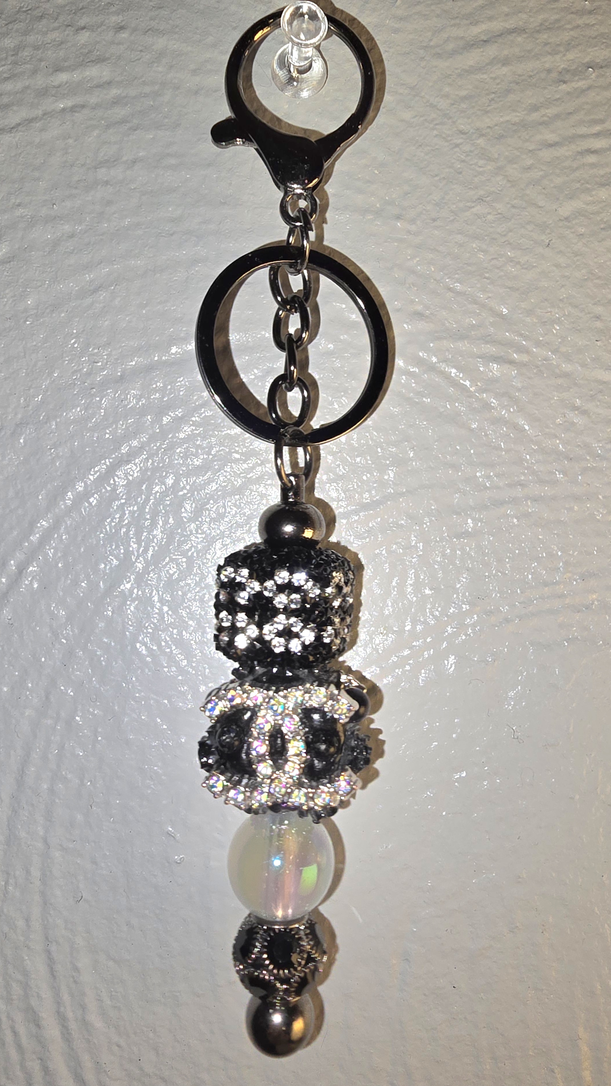 This piece is a moody-glam keychain that feels like a miniature treasure trove. Suspended from a sleek black metal clasp and chain, it features a vertical cascade of ornamental beads, each with its own distinct personality: