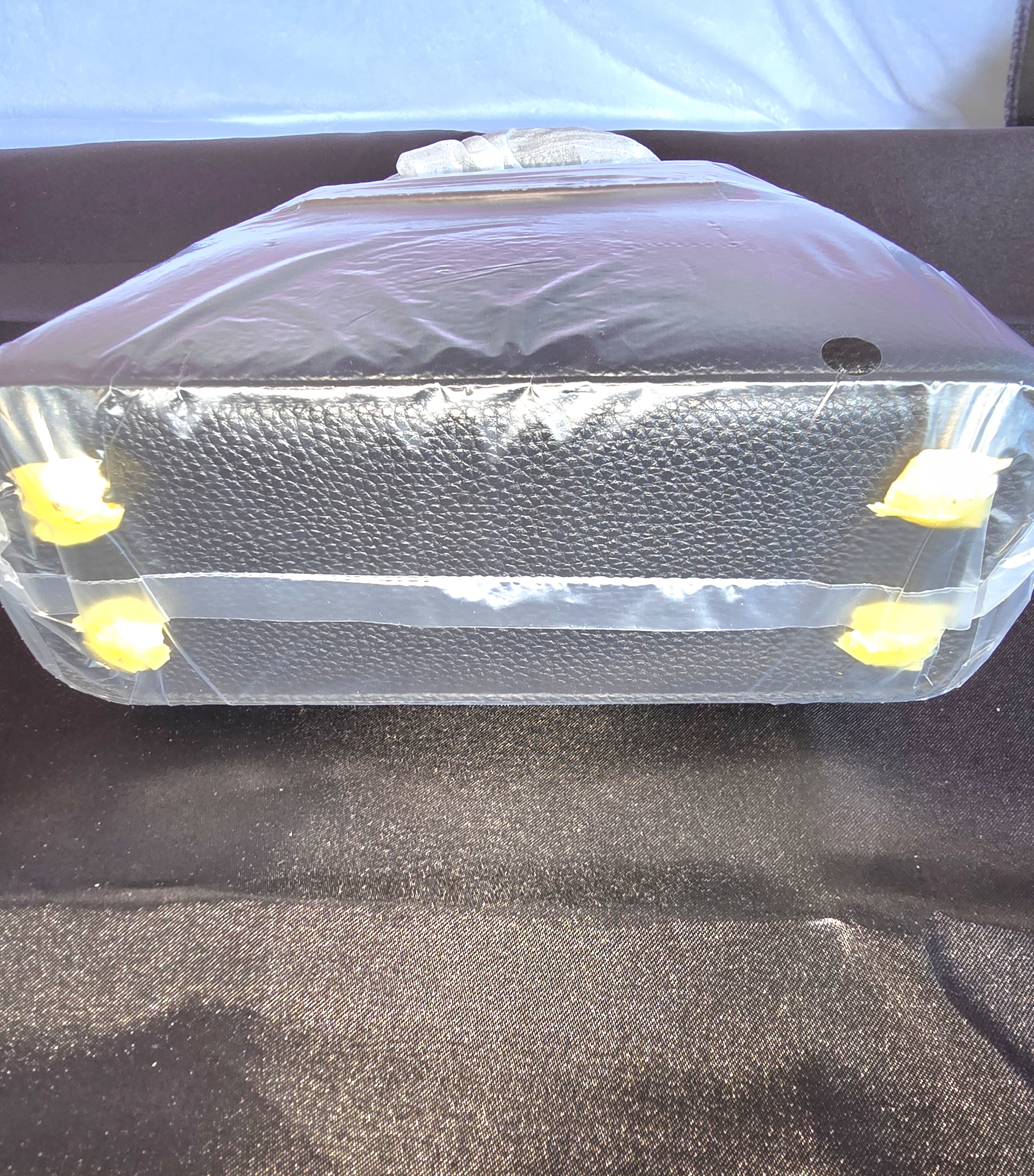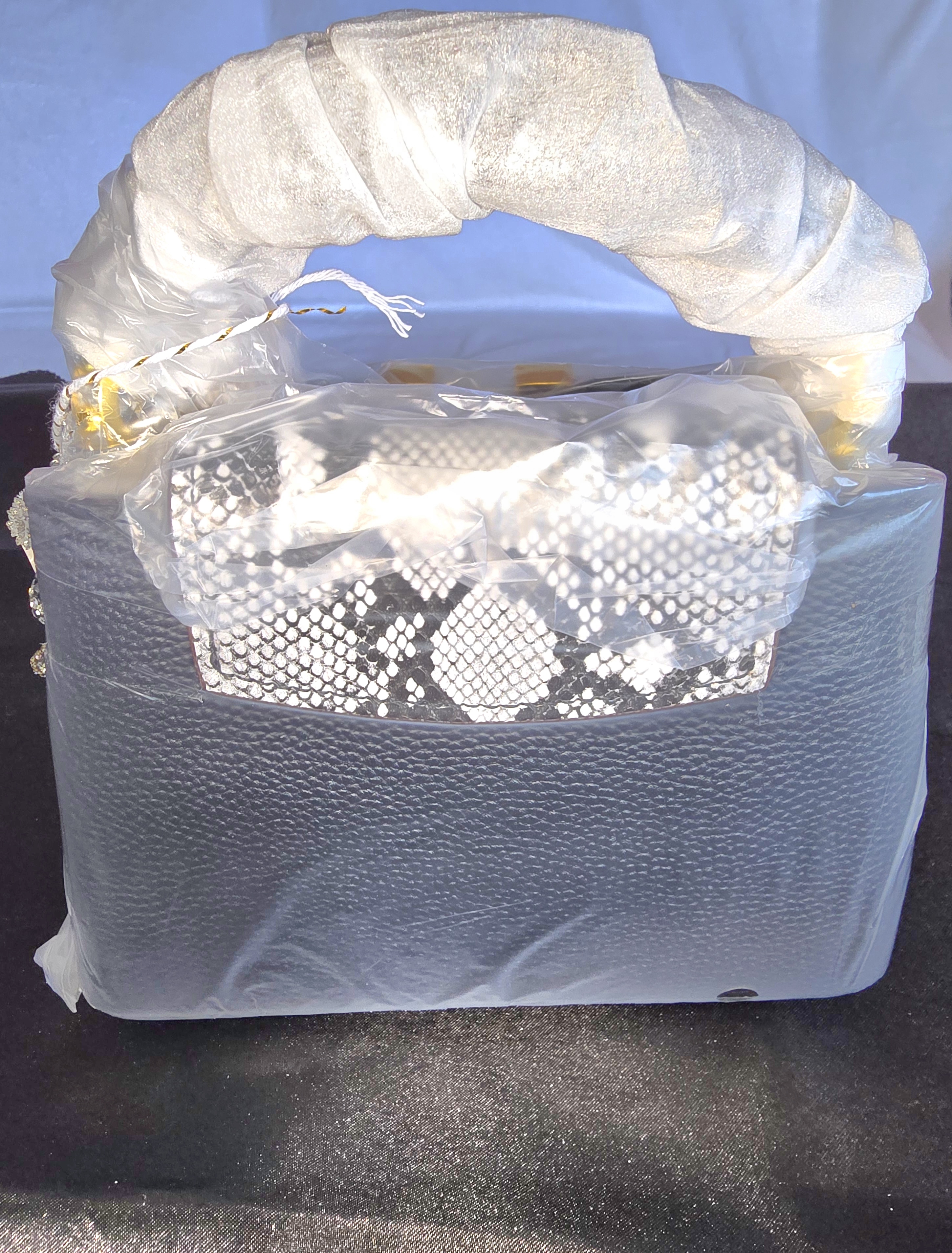 • The handbag rests on a plastic-covered surface, hinting at either a showroom setup or a behind-the-scenes styling moment.