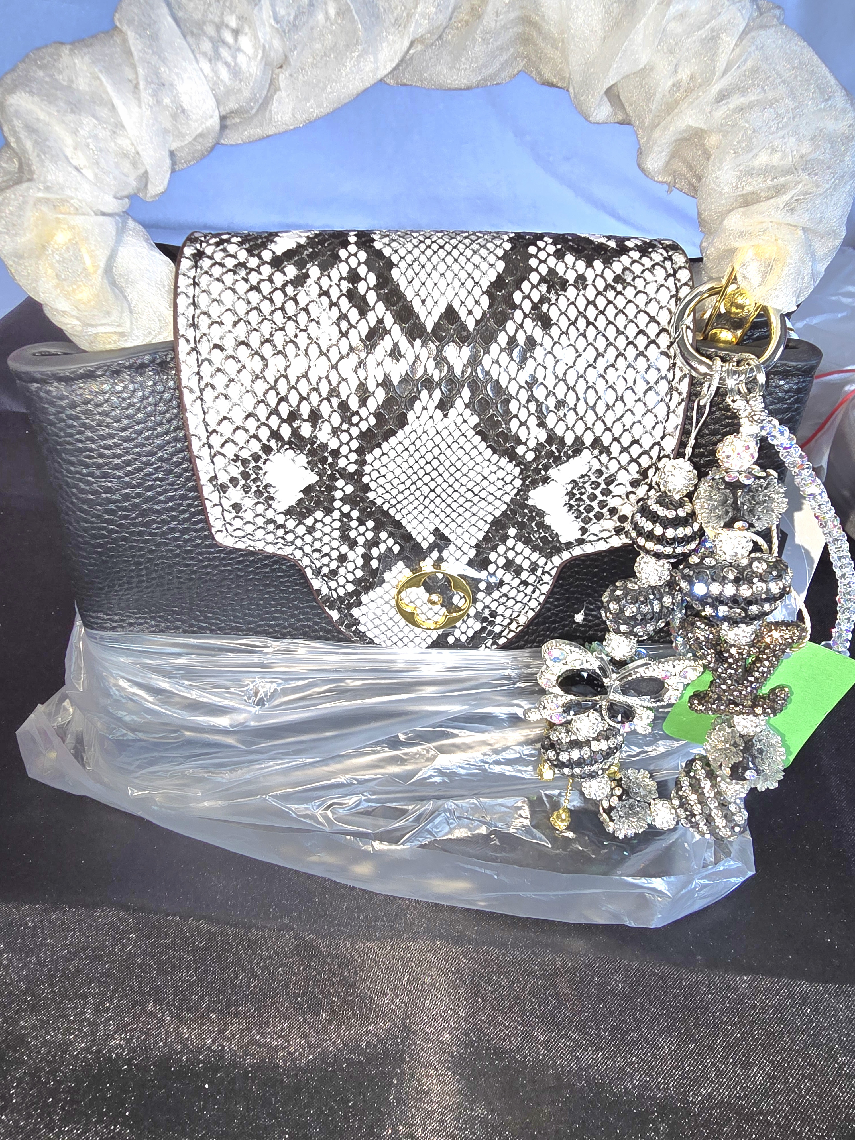 • Flap: Black and white snakeskin pattern, adding a bold, exotic edge.