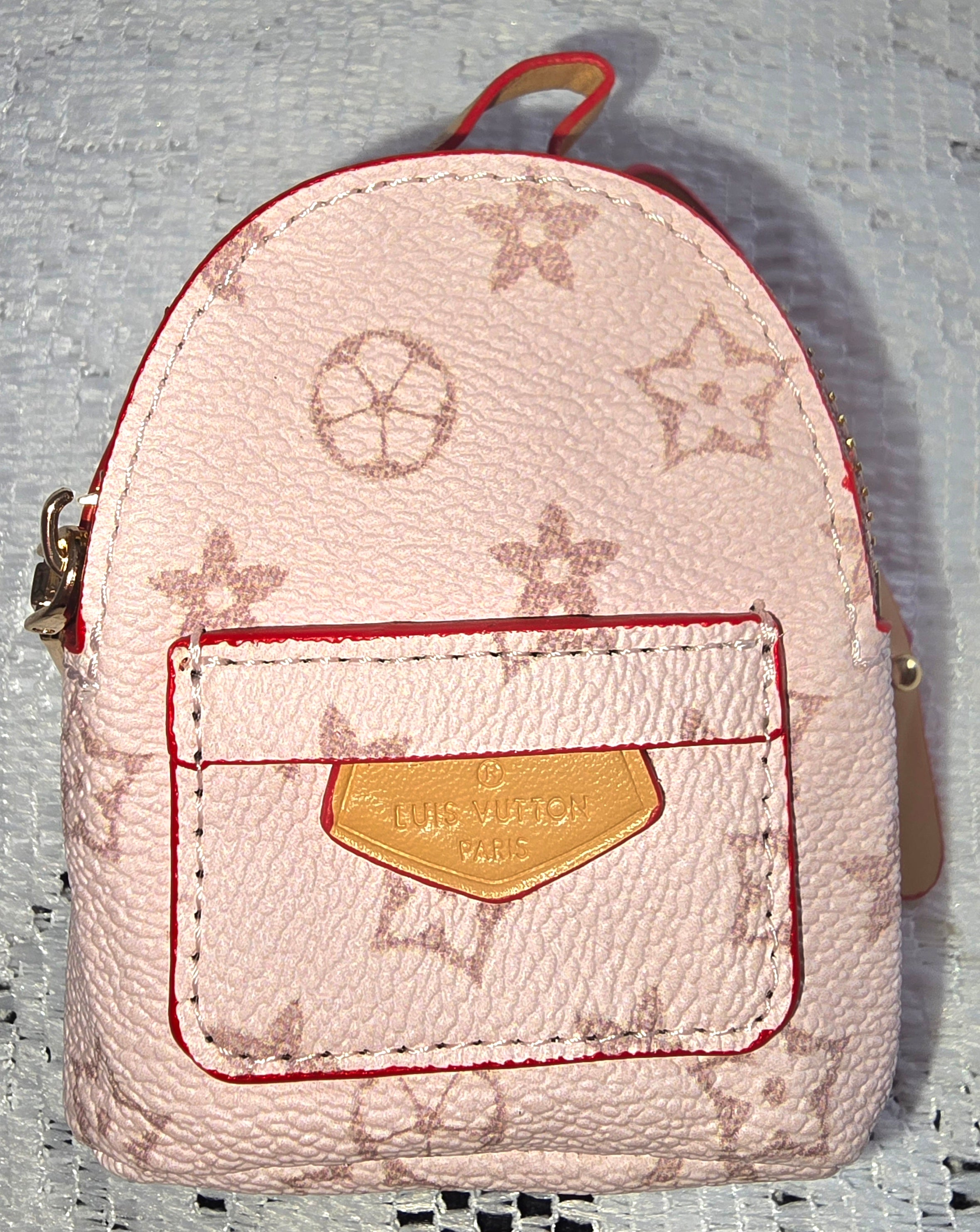 This petite functional backpack-style charm is a confection of elegance and whimsy. Crafted from pebbled leather in a soft blush pink, it features the iconic LV monogram in a slightly deeper rose hue, creating a tonal tapestry of luxury. The miniature front pocket is adorned with a gleaming gold-tone plaque stamped adding a touch of heritage glamour. A loop at the top offers playful contrast and versatile attachment, while the zipper closure ensures secure storage for tiny treasures. Whether clipped to a handbag or worn as a statement charm, it evokes the charm of Parisian chic in a bite-sized silhouette.
