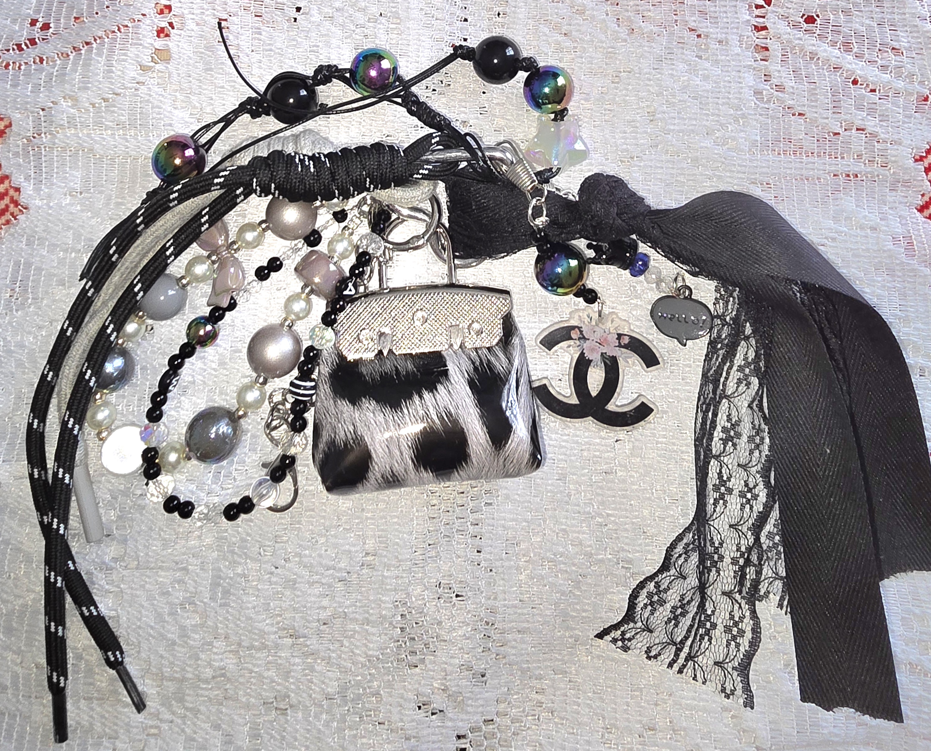 This accessory is a decadent fusion of Parisian glamour and playful mystique. At its heart is a miniature faux animal-print handbag charm, evoking the allure of exotic luxury. The black and white beaded strand dances between iridescent shimmer and matte elegance, while the stitched ribbon and lace bow add a couture-like softness. Crystal accents and a heart-shaped bead whisper romance, and the iconic CC logos—engraved and gleaming—anchor the piece in unmistakable high fashion.